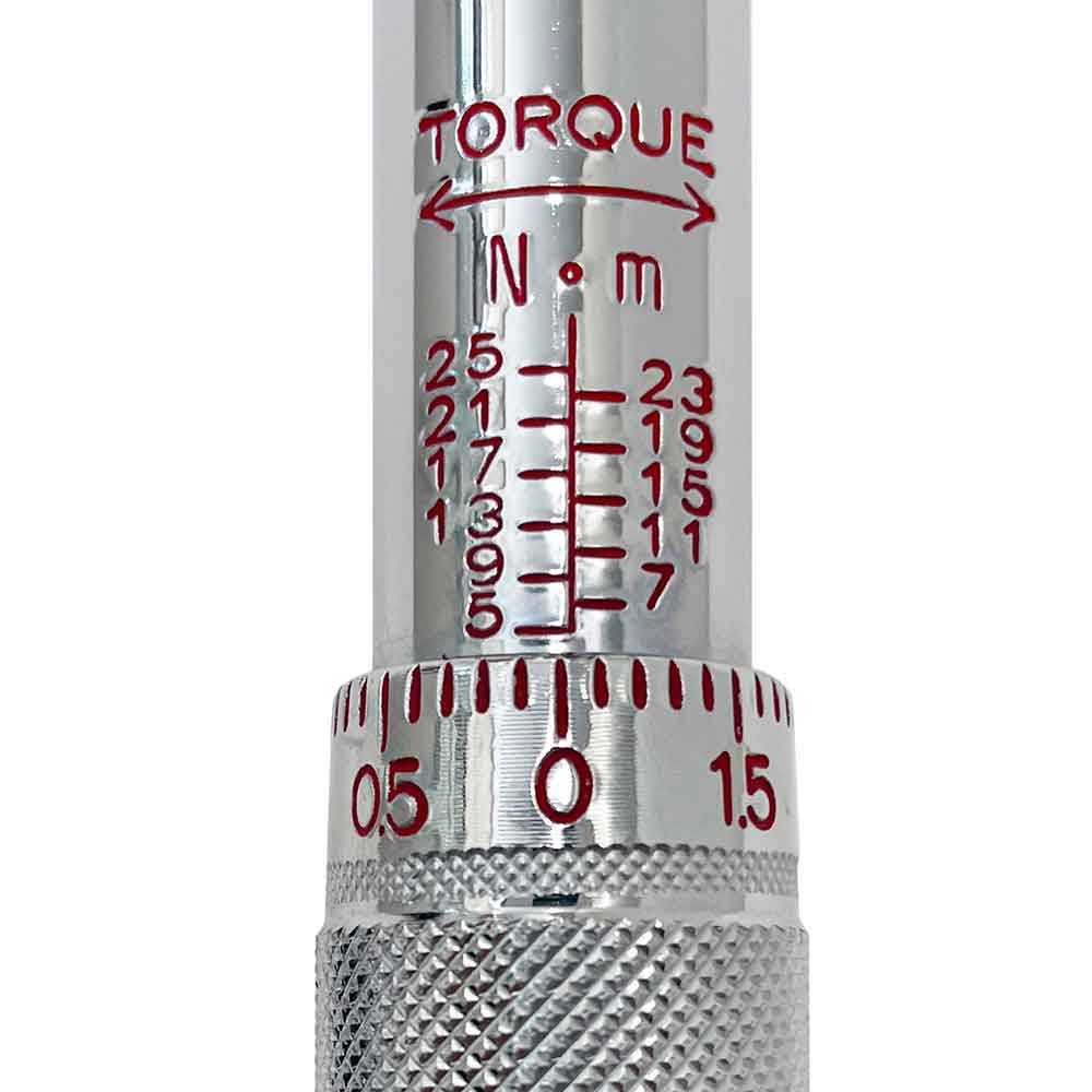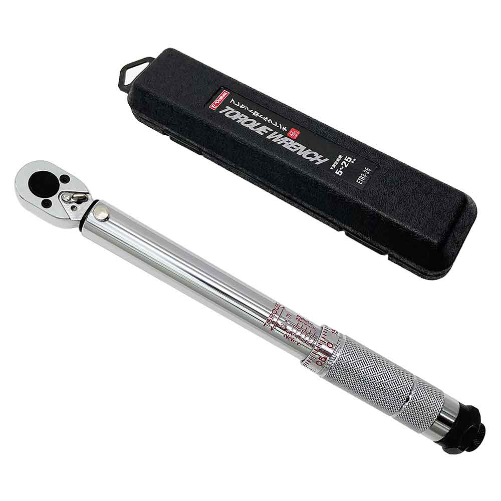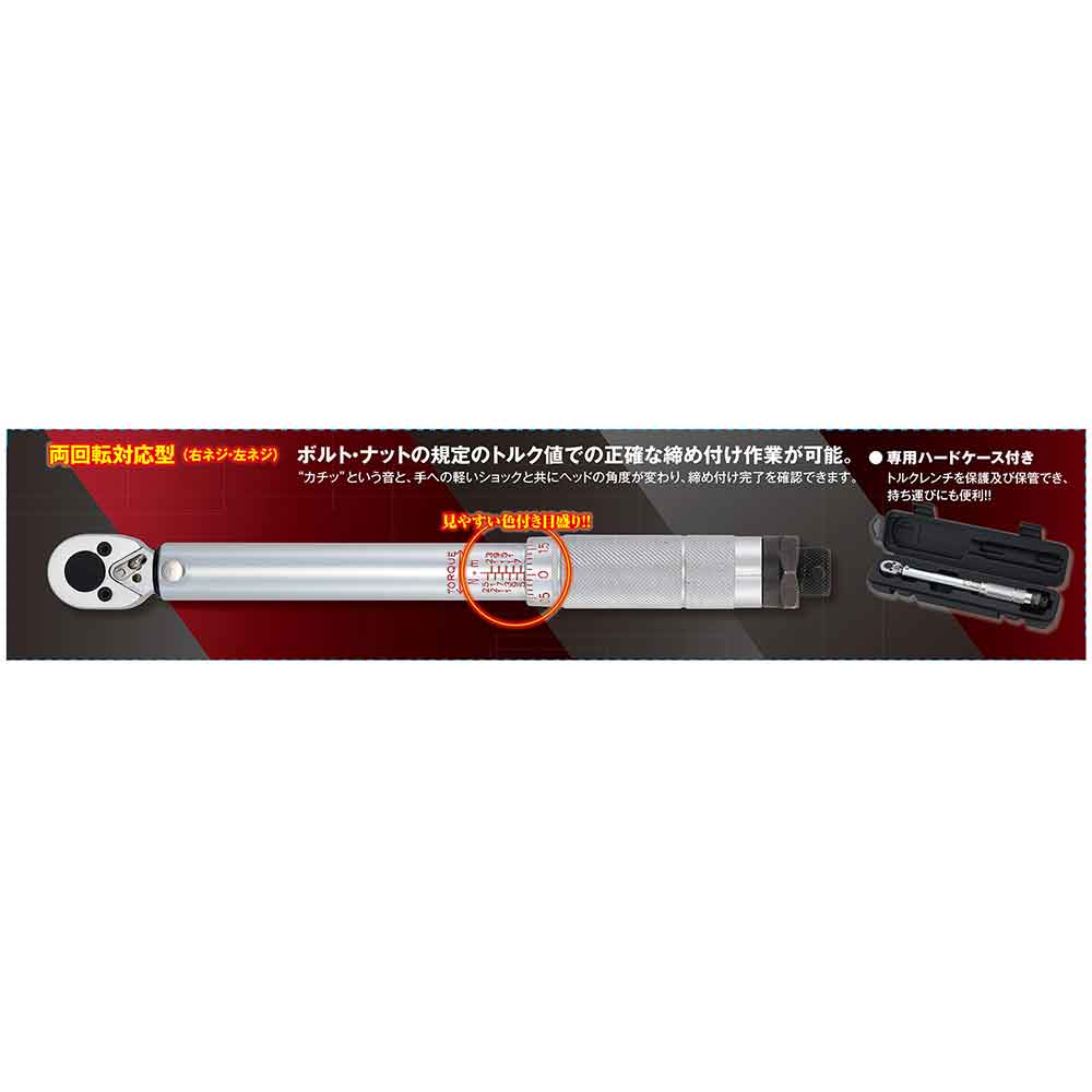 ボルト、ナットの所定トルク値での正確な締め付け作業が可能です。 所定のトルクでのネジの締め付け。 カチッという音と、手への軽いショックと共にヘッドの角度が変わり、締め付け完了を確認できます。 見やすい色付き目盛付きです。 両回転(右ネジ・左ネジ)対応型です。 専用のハードケース付でトルクレンチを保護及び保管ができ、持ち運びにも便利です。 ●差込角:9.5mm(3/8インチ)。 ●トルク設定範囲:5~25N・m。 ●セット内容:専用ハードケース。