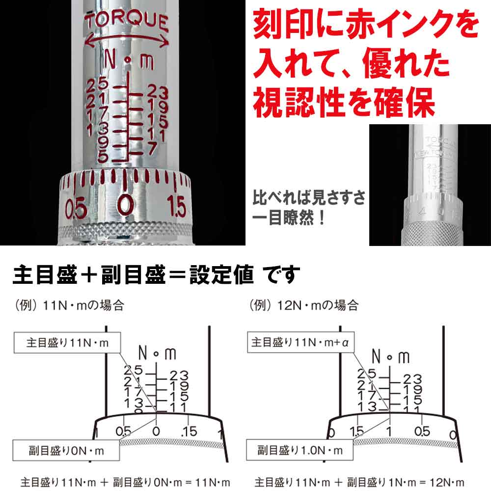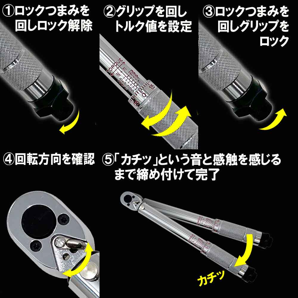 最大目盛り以上、最小目盛り以下のトルクでは使用しないでください。グリップの力点ラインを中心に握り、ボルトに対してレンチを直角の状態に維持しながら、レンチに対して垂直方向にゆっくりと力を掛けてください。誤った使用方法により、正確な測定ができない場合や音・ショックを感じ取りにくいことで、設定トルクを大きく超えて力をかけ過ぎてしまう恐れがありますので注意してください。測定時に「カチッ」という音がしたり、手に軽いショックを受けたらそれ以上レンチを回さないでください。過荷重による事故につながる恐れがあります。初めて使用される際は、その間隔を養ってください(特に低トルクの時は、音・ショックが感じ取りにくく、設定トルクを大きく超えて力を掛け過ぎてしまう恐れがありますので注意してください。ボルトの破損、トルクレンチの故障の原因になります)。 このトルクレンチは出荷前に厳格な調整はしていますが、特に保証用等の精密な作業には構造上向きません。ボルト・ナット・ネジや対象物の注意事項や指示書を読み、正しい状態で使用してください。ソケットはボルト・ナットに対して斜めがけや浅掛けをしないよう、奥まで完全に差し込んで使用してください。ドライブ角は根元まで完全に差し込んでください。ハンドルにパイプを継ぎ足したり、ハンマーなどで叩いたり、足で踏んでの使用はしないでください。長時間使用にならなかった場合は、内部の潤滑油がパーツに行き渡る様に最初に低いトルク値で何度か操作してください。 このトルクレンチはボルト・ナット・ネジ等を手動で緩めることのみを目的に設定されています。本来の目的、目途以外での使用はしないでください。レンチの分解・改造・調整・注油は絶対にしないでください。トルク値が狂う可能性があります。作業不良・異常音・水没等の状況が発生した場合や、割れ・欠け・摩耗・変形等の異常が認められた場合は、使用しないでください。無理な姿勢で作業しないでください。常に足場・周辺を確認して使用してください。
