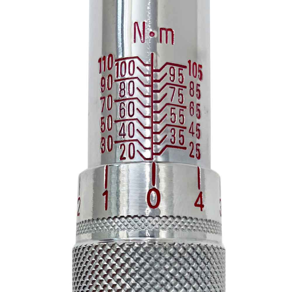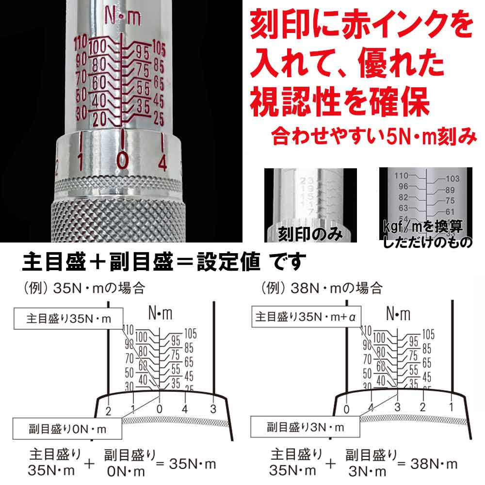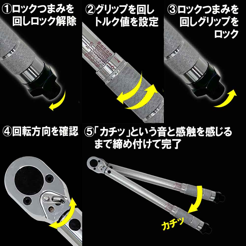 最大目盛り以上、最小目盛り以下のトルクでは使用しないでください。グリップの力点ラインを中心に握り、ボルトに対してレンチを直角の状態に維持しながら、レンチに対して垂直方向にゆっくりと力を掛けてください。誤った使用方法により、正確な測定ができない場合や音・ショックを感じ取りにくいことで、設定トルクを大きく超えて力をかけ過ぎてしまう恐れがありますので注意してください。測定時に「カチッ」という音がしたり、手に軽いショックを受けたらそれ以上レンチを回さないでください。過荷重による事故につながる恐れがあります。初めて使用される際は、その間隔を養ってください(特に低トルクの時は、音・ショックが感じ取りにくく、設定トルクを大きく超えて力を掛け過ぎてしまう恐れがありますので注意してください。ボルトの破損、トルクレンチの故障の原因になります)。 このトルクレンチは出荷前に厳格な調整はしていますが、特に保証用等の精密な作業には構造上向きません。ボルト・ナット・ネジや対象物の注意事項や指示書を読み、正しい状態で使用してください。ソケットはボルト・ナットに対して斜めがけや浅掛けをしないよう、奥まで完全に差し込んで使用してください。ドライブ角は根元まで完全に差し込んでください。ハンドルにパイプを継ぎ足したり、ハンマーなどで叩いたり、足で踏んでの使用はしないでください。長時間使用にならなかった場合は、内部の潤滑油がパーツに行き渡る様に最初に低いトルク値で何度か操作してください。 このトルクレンチはボルト・ナット・ネジ等を手動で緩めることのみを目的に設定されています。本来の目的、目途以外での使用はしないでください。レンチの分解・改造・調整・注油は絶対にしないでください。トルク値が狂う可能性があります。作業不良・異常音・水没等の状況が発生した場合や、割れ・欠け・摩耗・変形等の異常が認められた場合は、使用しないでください。無理な姿勢で作業しないでください。常に足場・周辺を確認して使用してください。