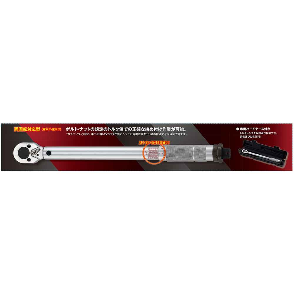 ボルト、ナットの所定トルク値での正確な締め付け作業が可能です。 所定のトルクでのネジの締め付け。 カチッという音と、手への軽いショックと共にヘッドの角度が変わり、締め付け完了を確認できます。 見やすい色付き目盛付きです。 両回転(右ネジ・左ネジ)対応型です。 専用のハードケース付でトルクレンチを保護及び保管ができ、持ち運びにも便利です。 ●差込角:9.5mm(3/8インチ)。 ●トルク設定範囲:20~110N・m。 ●セット内容:専用ハードケース。