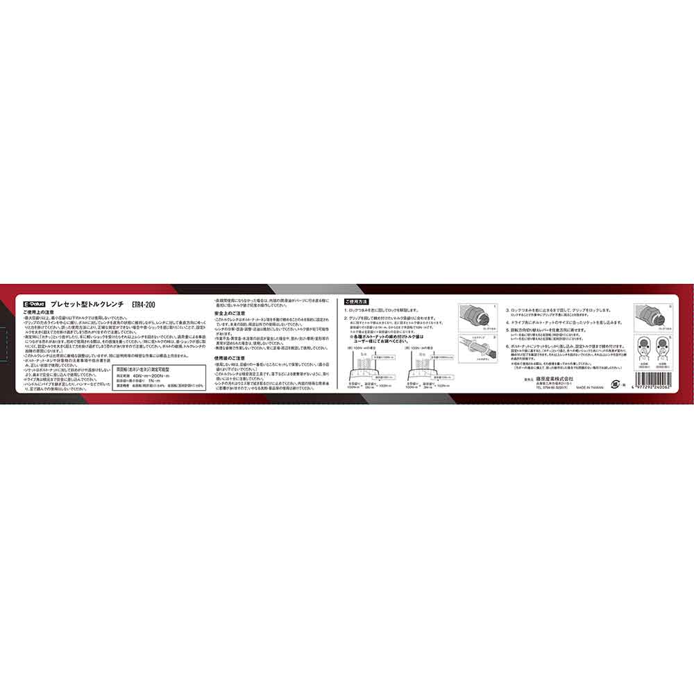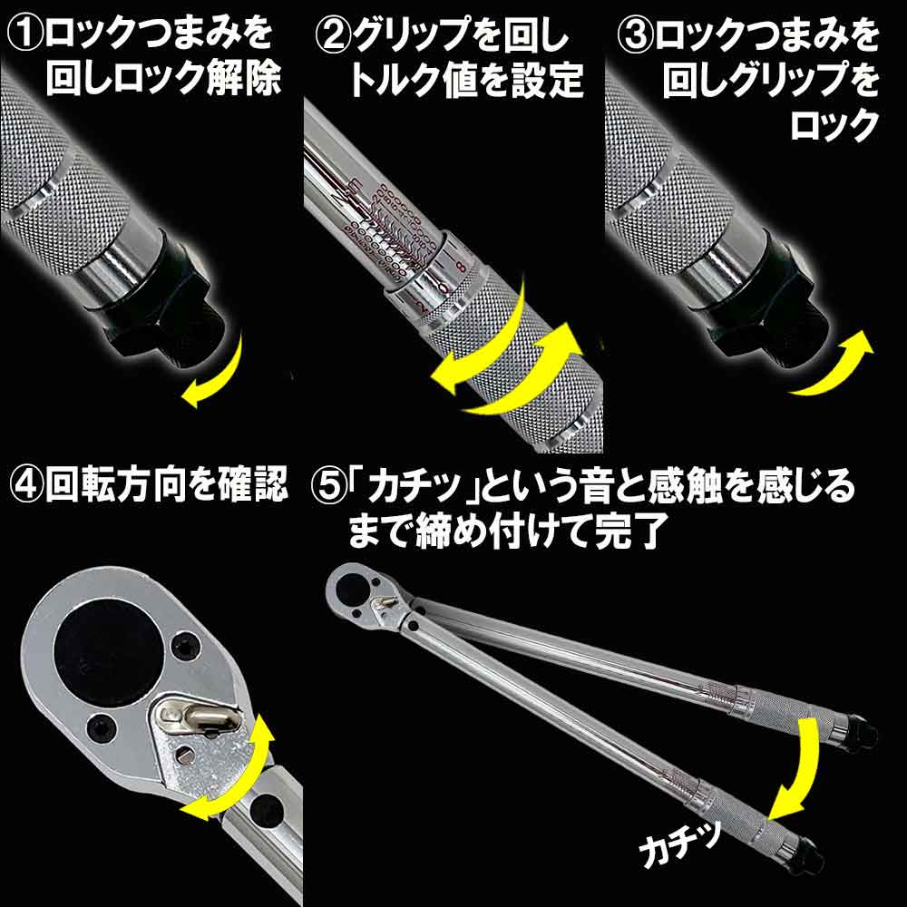 最大目盛り以上、最小目盛り以下のトルクでは使用しないでください。グリップの力点ラインを中心に握り、ボルトに対してレンチを直角の状態に維持しながら、レンチに対して垂直方向にゆっくりと力を掛けてください。誤った使用方法により、正確な測定ができない場合や音・ショックを感じ取りにくいことで、設定トルクを大きく超えて力をかけ過ぎてしまう恐れがありますので注意してください。測定時に「カチッ」という音がしたり、手に軽いショックを受けたらそれ以上レンチを回さないでください。過荷重による事故につながる恐れがあります。初めて使用される際は、その間隔を養ってください(特に低トルクの時は、音・ショックが感じ取りにくく、設定トルクを大きく超えて力を掛け過ぎてしまう恐れがありますので注意してください。ボルトの破損、トルクレンチの故障の原因になります)。 このトルクレンチは出荷前に厳格な調整はしていますが、特に保証用等の精密な作業には構造上向きません。ボルト・ナット・ネジや対象物の注意事項や指示書を読み、正しい状態で使用してください。ソケットはボルト・ナットに対して斜めがけや浅掛けをしないよう、奥まで完全に差し込んで使用してください。ドライブ角は根元まで完全に差し込んでください。ハンドルにパイプを継ぎ足したり、ハンマーなどで叩いたり、足で踏んでの使用はしないでください。長時間使用にならなかった場合は、内部の潤滑油がパーツに行き渡る様に最初に低いトルク値で何度か操作してください。 このトルクレンチはボルト・ナット・ネジ等を手動で緩めることのみを目的に設定されています。本来の目的、目途以外での使用はしないでください。レンチの分解・改造・調整・注油は絶対にしないでください。トルク値が狂う可能性があります。作業不良・異常音・水没等の状況が発生した場合や、割れ・欠け・摩耗・変形等の異常が認められた場合は、使用しないでください。無理な姿勢で作業しないでください。常に足場・周辺を確認して使用してください。