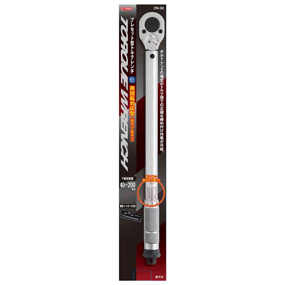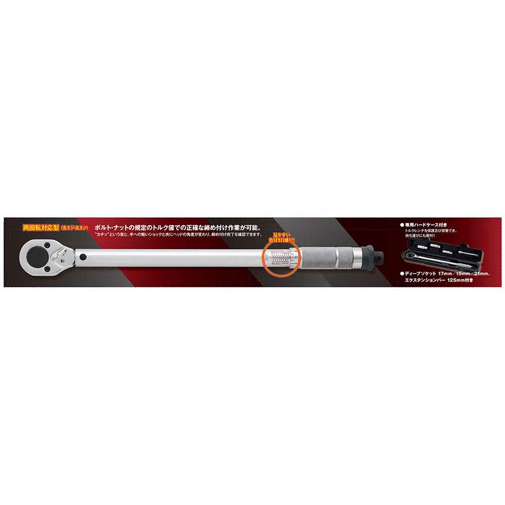 ボルト、ナットの所定トルク値での正確な締め付け作業が可能です。 所定のトルクでのネジの締め付け。 カチッという音と、手への軽いショックと共にヘッドの角度が変わり、締め付け完了を確認できます。 見やすい色付き目盛付きです。 両回転(右ネジ・左ネジ)対応型です。 専用のハードケース付でトルクレンチを保護及び保管ができ、持ち運びにも便利です。 ●差込角:12.7mm(1/2インチ)。 ●トルク設定範囲:40~200N・m。 ●セット内容:専用ハードケース・ディープソケット(17・19・21mm)・エクステンションバー125mm。