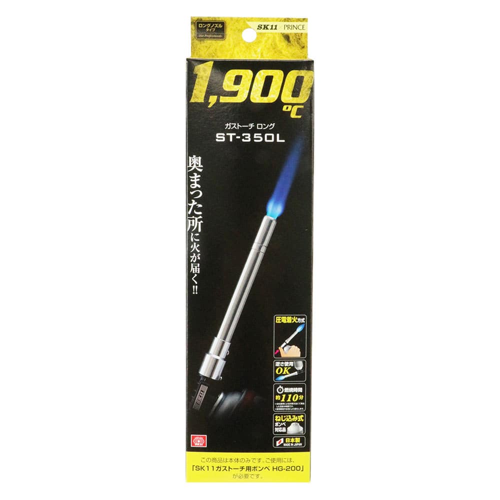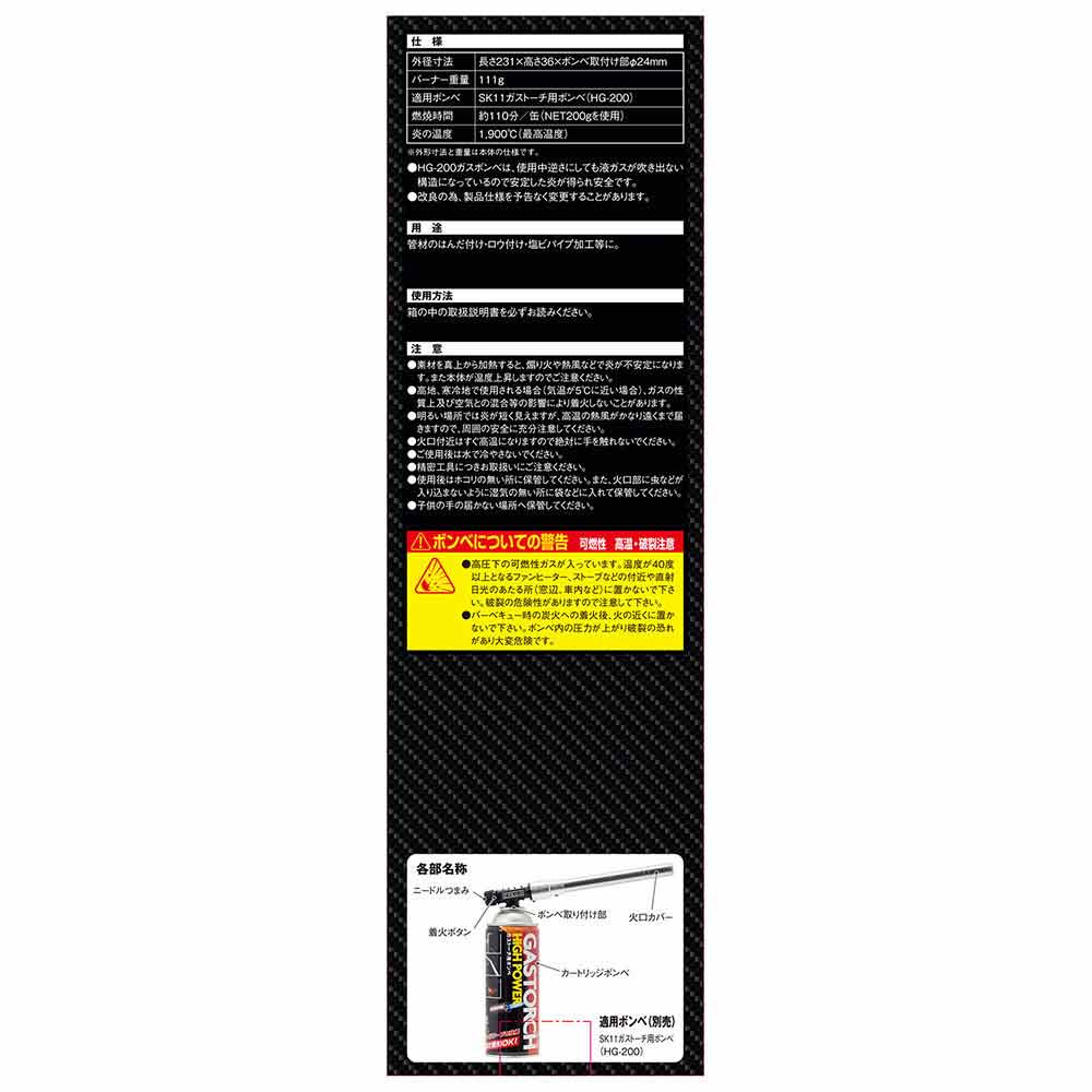 本体のみです。ご使用にはSK11ガストーチ用ボンベ(HG-200)が必要です。 ご使用前に必ず取扱説明書、使用上の注意をお読みください。高圧下の可燃性ガスが入っています。温度が40度以上となるファンヒーター、ストーブなどの付近や直射日光のあたる所(窓辺、車内など)に置かないで下さい。破裂の危険性があります。 バーベキュー時の炭火への着火後、火の近くに置かないで下さい。ボンベ内の圧力が上がり破裂の恐れがあり大変危険です。