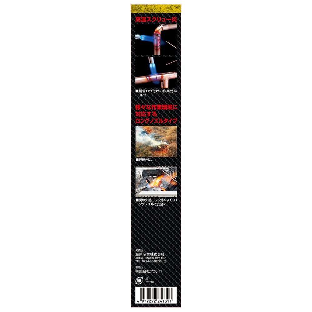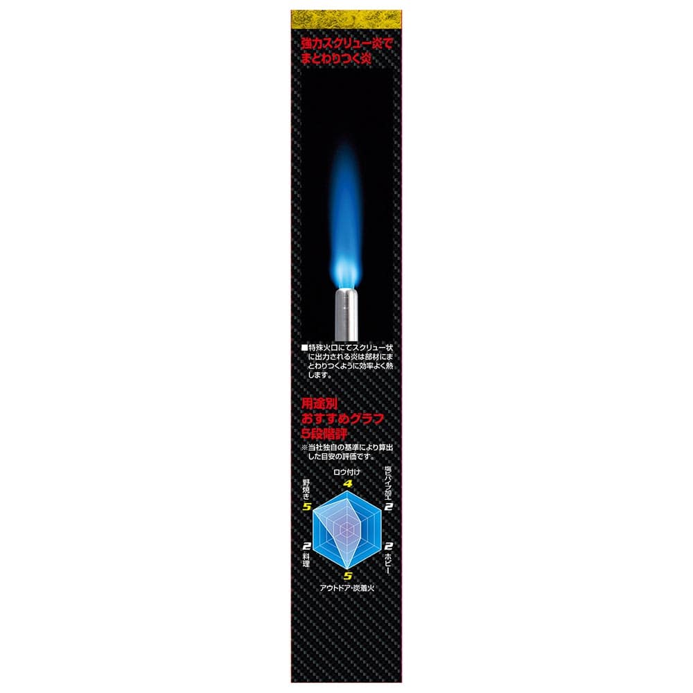 ロングノズルで安心、安全なガストーチです。 配管のロウ付け、炭火起こし、解氷、時代焼き、野焼き等。 強力なスクリュー炎は部材にまとわりつくように効率よく熱します。 高温(1900度)で銅管ロウ付けの作業効率がアップします。 様々な作業環境に対応するロングノズルタイプで、炭火や野焼きなどの着火に最適です。 ワンタッチで着火できます。 別売の適用ボンベHG-200は、使用中逆さにしても液ガスが噴き出ない構造になっているので安定した炎が得られ安全です(必ず、適用ボンベHG-200をお使いください)。 ●本体のみ(ガスボンベ(HG-200)別売)。 ●着火方式:圧電着火方式(プッシュタイプ)。 ●逆さ使用OK。 ●炎のタイプ:スクリュー炎。 ●炎の温度:1900度(最高温度)・燃焼時間:約110分/缶(適用ボンベを使用)。 ●適用ボンベ(別売):SK11ガストーチ用ボンベ(HG-200)・ねじ込み式ボンベ対応品。 ●バーナー本体外形寸法:長さ231mm×高さ36mm・ボンベ取り付け部径24mm。 ●バーナー本体重量:111g。
