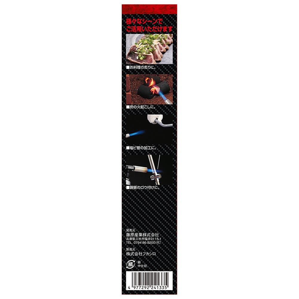 コンパクトでもパワフルな炎でプロも納得です。 炭火おこし、料理、ロウ付け、解氷、時代焼き等。 パワフルな集中炎で力強く対象物を熱します。 高温(1700度)で炭火おこし、料理の炙り、エンビ管の加工、銅管のロウ付け等の様々なシーンでご活用いただけます。 ワンタッチで着火します。 別売の適用ボンベHG-200は、使用中逆さにしても液ガスが噴き出ない構造になっているので安定した炎が得られ安全です(必ず、適用ボンベHG-200をお使いください)。 ●本体のみ(ガスボンベ(HG-200)別売)。 ●着火方式:圧電着火方式(プッシュ式)。 ●逆さ使用OK。 ●炎のタイプ:集中炎。 ●炎の温度:1700度(最高温度)・燃焼時間:約100分/缶(適用ボンベを使用)。 ●適用ボンベ(別売):SK11ガストーチ用ボンベ(HG-200)・ねじ込み式ボンベ対応品。 ●バーナー本体外形寸法:長さ122mm×高さ75mm・ボンベ取り付け部径32mm。 ●バーナー本体重量:251g。
