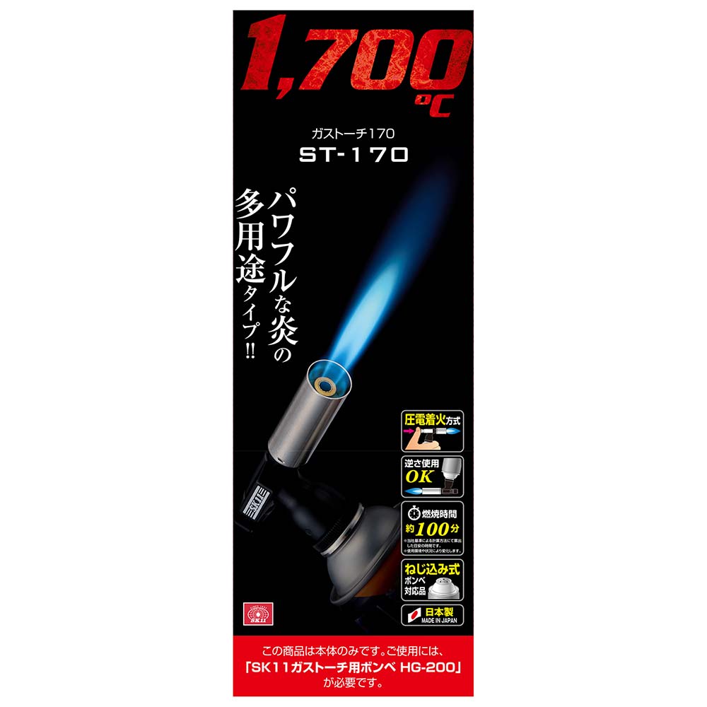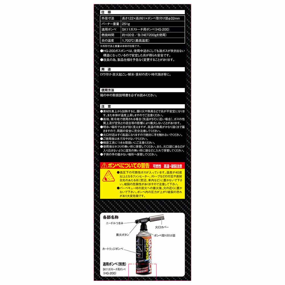 本体のみです。ご使用にはSK11ガストーチ用ボンベ(HG-200)が必要です。 ご使用前に必ず取扱説明書、使用上の注意をお読みください。高圧下の可燃性ガスが入っています。温度が40度以上となるファンヒーター、ストーブなどの付近や直射日光のあたる所(窓辺、車内など)に置かないで下さい。破裂の危険性があります。 バーベキュー時の炭火への着火後、火の近くに置かないで下さい。ボンベ内の圧力が上がり破裂の恐れがあり大変危険です。