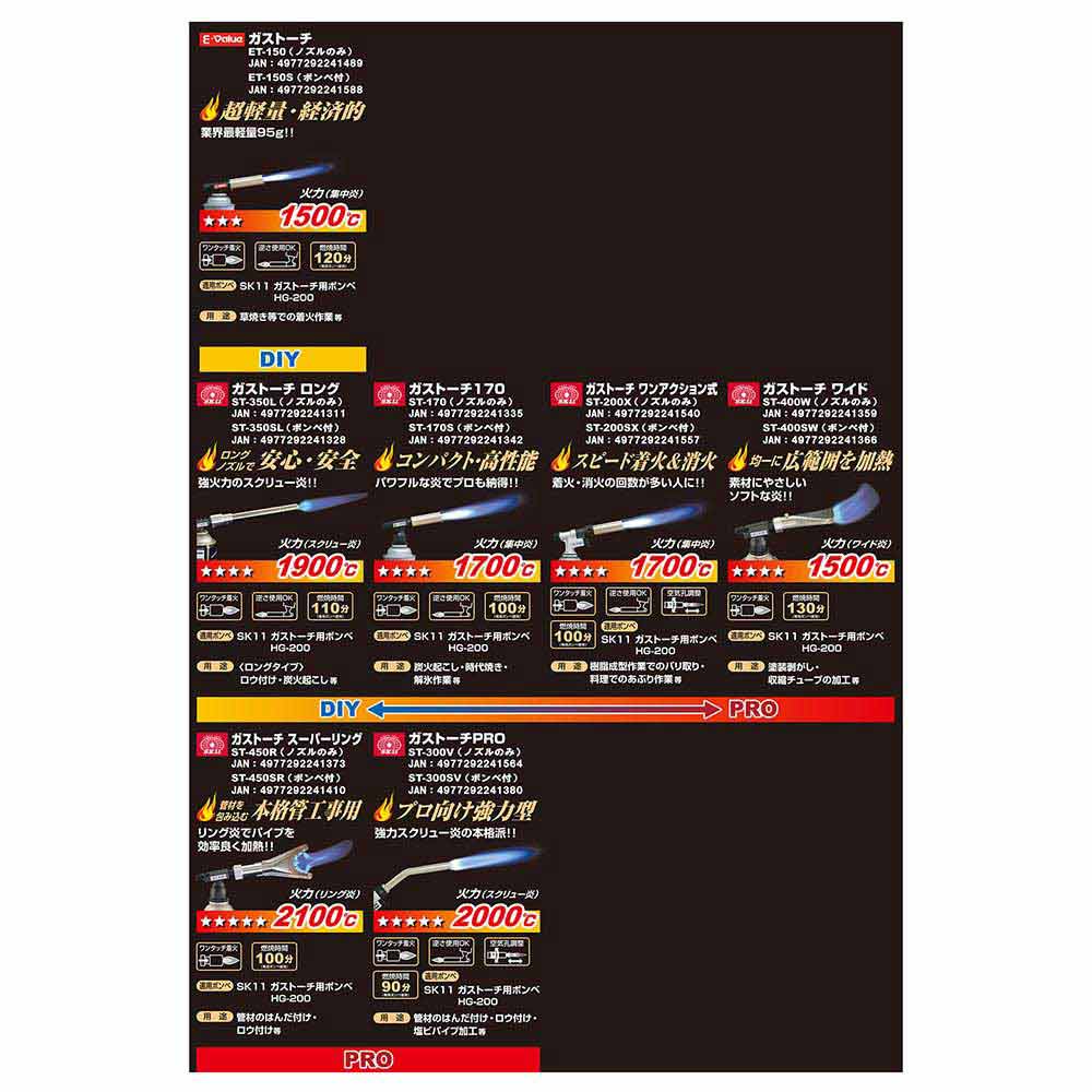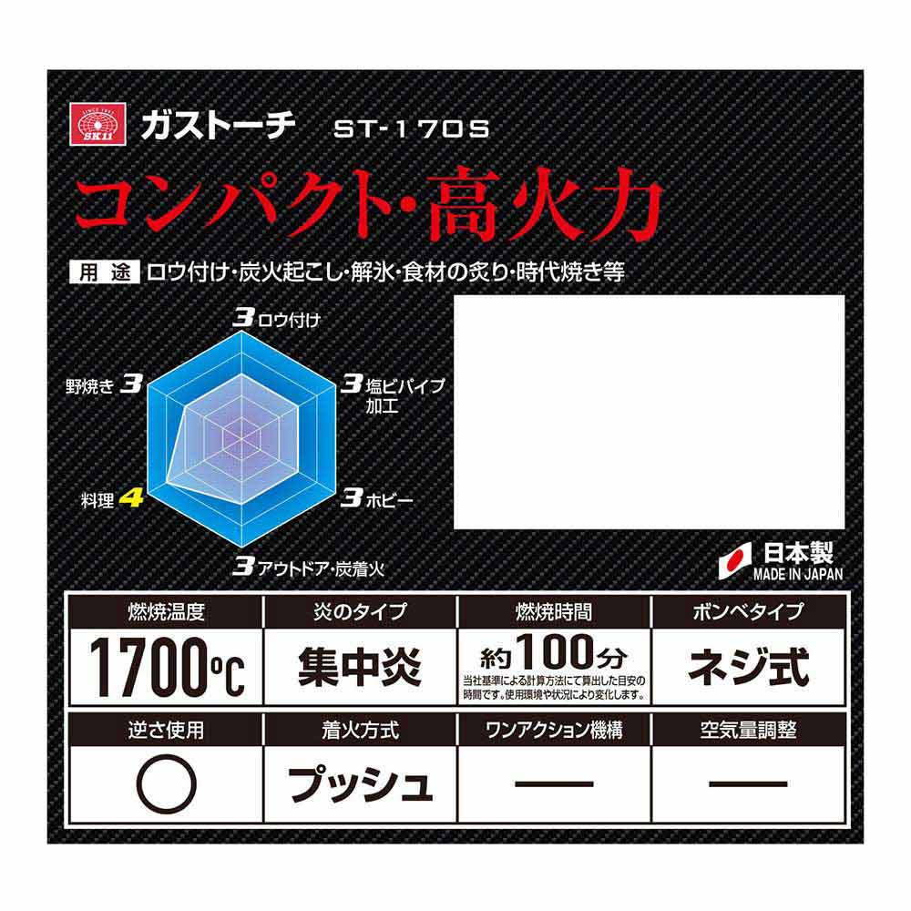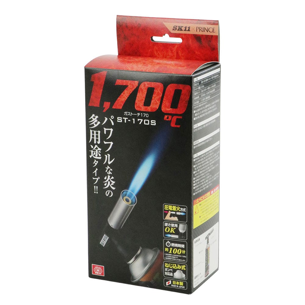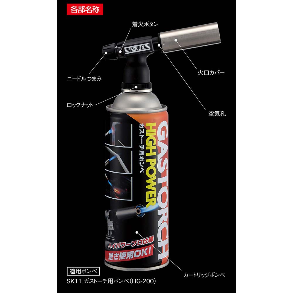 コンパクトでもパワフルな炎でプロも納得です。 炭火おこし、料理、ロウ付け、解氷、時代焼き等。 パワフルな集中炎で力強く対象物を熱します。 高温(1700度)で炭火おこし、料理の炙り、エンビ管の加工、銅管のロウ付け等の様々なシーンでご活用いただけます。 ワンタッチで着火します。 付属の適用ボンベHG-200は、使用中逆さにしても液ガスが噴き出ない構造になっているので安定した炎が得られ安全です(必ず、適用ボンベHG-200をお使いください)。 ●ガスボンベHG-200(内容量200g)付。 ●着火方式:圧電着火方式(プッシュタイプ)。 ●逆さ使用OK。 ●炎のタイプ:集中炎。 ●炎の温度:1700度(最高温度)・燃焼時間:約100分/缶(適用ボンベを使用)。 ●適用ボンベ:SK11ガストーチ用ボンベ(HG-200)・ねじ込み式ボンベ対応品。 ●バーナー本体外形寸法:長さ122mm×高さ75mm・ボンベ取り付け部径32mm。 ●バーナー本体重量:251g。 ●付属品:ガスボンベ(HG-200)。