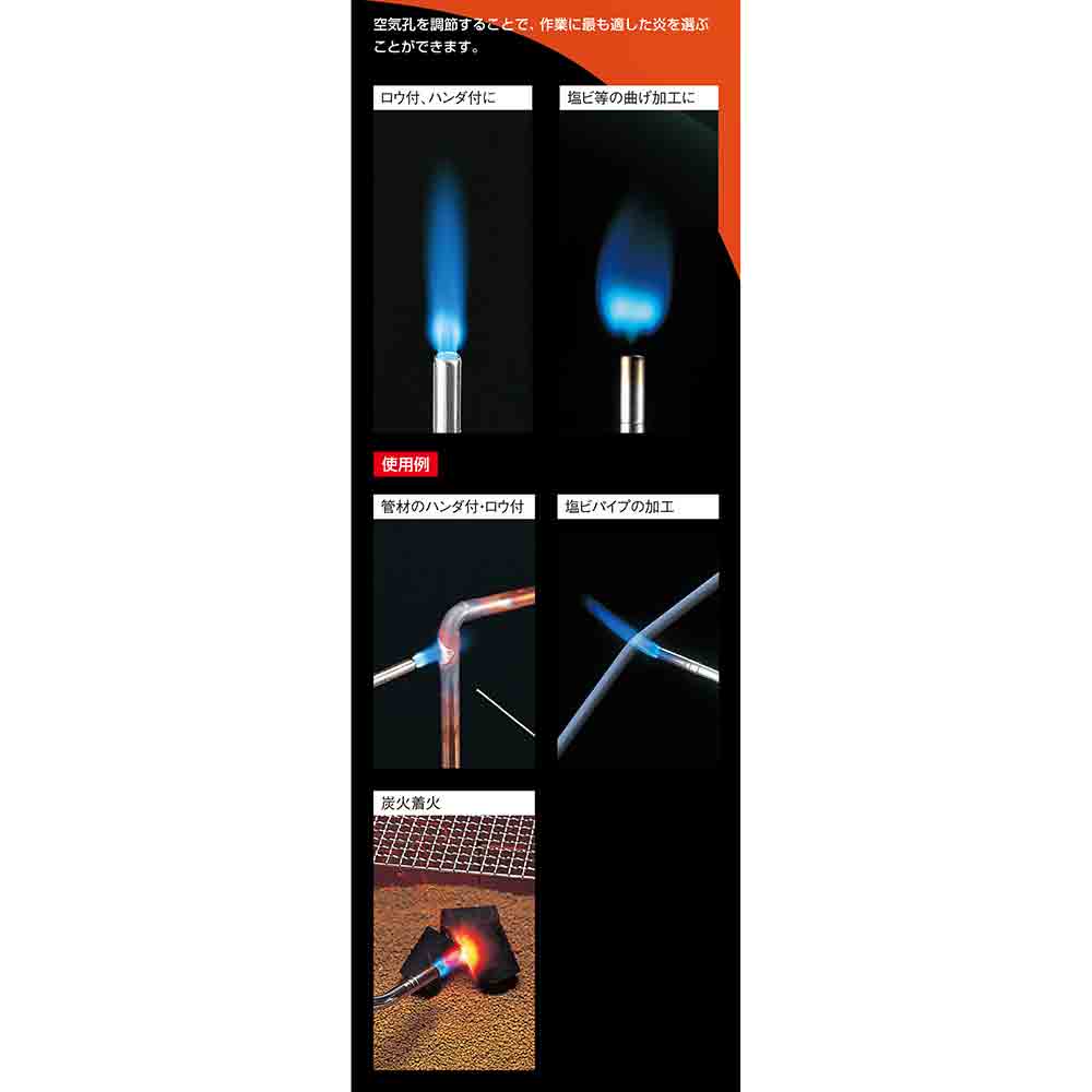 素材を真上から加熱すると、煽り火や熱風などで炎が不安定になります。また本体が温度上昇しますのでご注意ください。使用後はボンベを外し、ほこりが入らないように袋又は箱に入れて保管して下さい。火口付近はすぐ高温になりますので絶対に手を触れないで下さい。子供の手の届かない場所へ保管して下さい。 高地、寒冷地で使用される場合(気温が5度に近い場合)ガスの性質上及び空気との混合等の影響により着火しないことがあります。 明るい場所では炎が短く見えますが、高温の熱風がかなり遠くまで届きますので、周囲の安全に充分注意してください。ご使用後は水で冷やさないでください。精密工具につきお取り扱いにご注意ください。