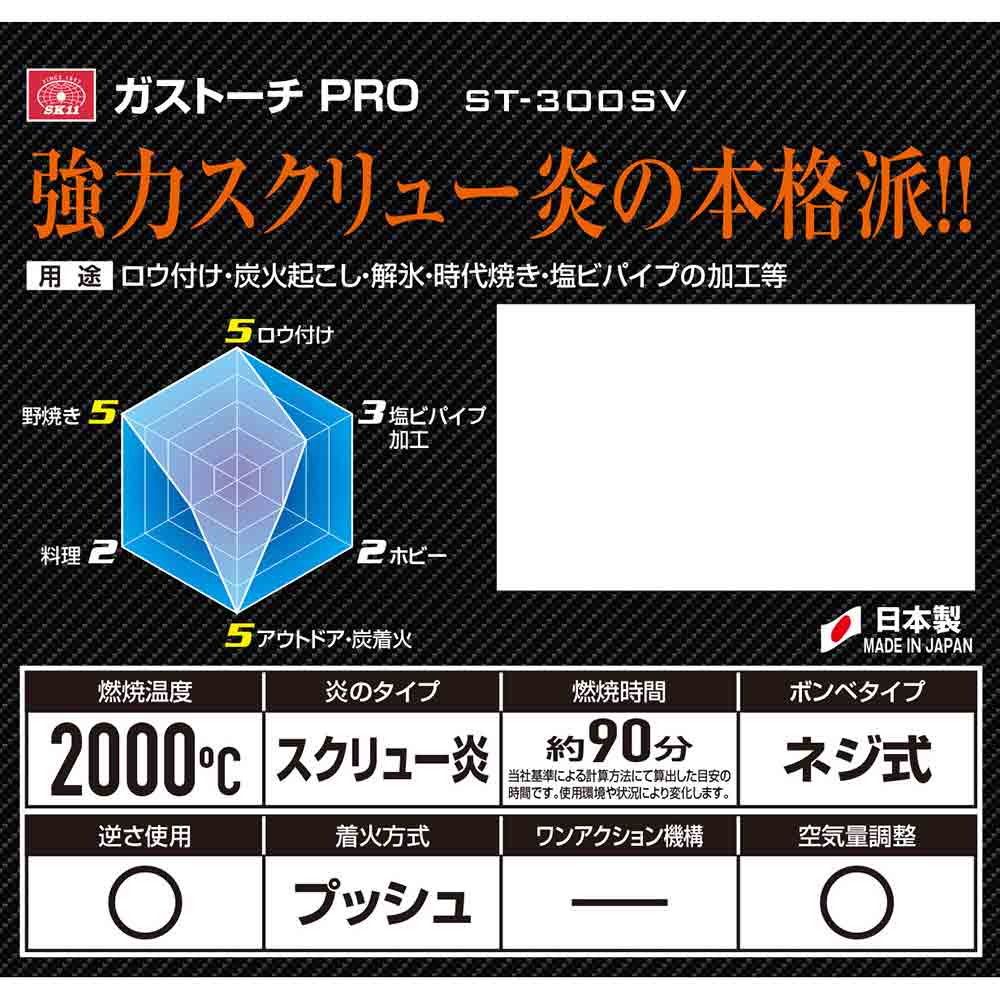 パワフルでシャープな炎、簡単に使えて大きな威力を発揮するプロ向け本格派トーチです。 炭火着火、塩ビパイプの加工、銅管のハンダ・ロウ付作業等。 強力なスクリュー炎は部材にまとわりつくように効率よく熱します。 高温(2000度)で銅管ロウ付けの作業効率がアップします。 空気孔を調節することで作業に最も適した炎を選ぶことができます。 ワンタッチで着火します。 別売の適用ボンベHG-200は、使用中逆さにしても液ガスが噴き出ない構造になっているので安定した炎が得られ安全です(必ず、適用ボンベHG-200をお使いください)。 ●ガスボンベHG-200(内容量200g)付。 ●着火方式:圧電着火方式(プッシュタイプ)。 ●逆さ使用OK・空気孔調整。 ●炎のタイプ:スクリュー炎。 ●炎の温度:2000度(最高温度)・燃焼時間:約90分/缶(適用ボンベ使用時)。 ●適用ボンベ:SK11ガストーチ用ボンベ(HG-200)・ねじ込み式ボンベ対応品。 ●バーナー本体外形寸法:高さ218×幅60mm・ボンベ取り付け部径30mm。 ●バーナー本体重量:236g。 ●付属品:ガスボンベ(HG-200)。