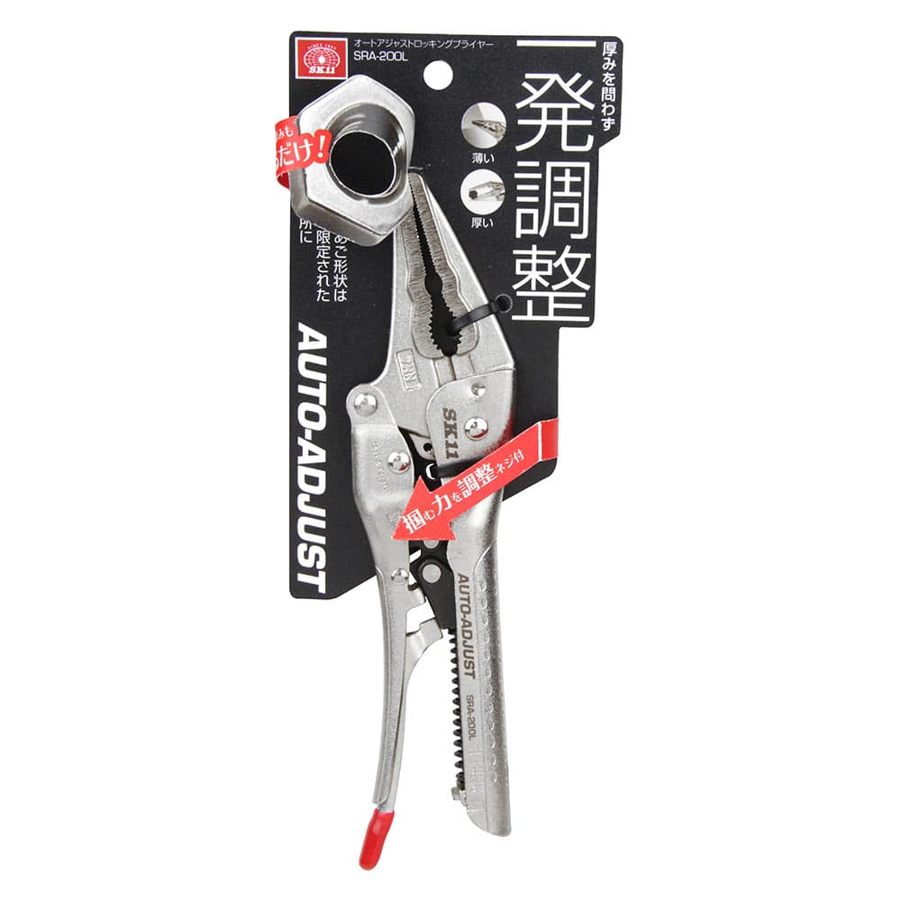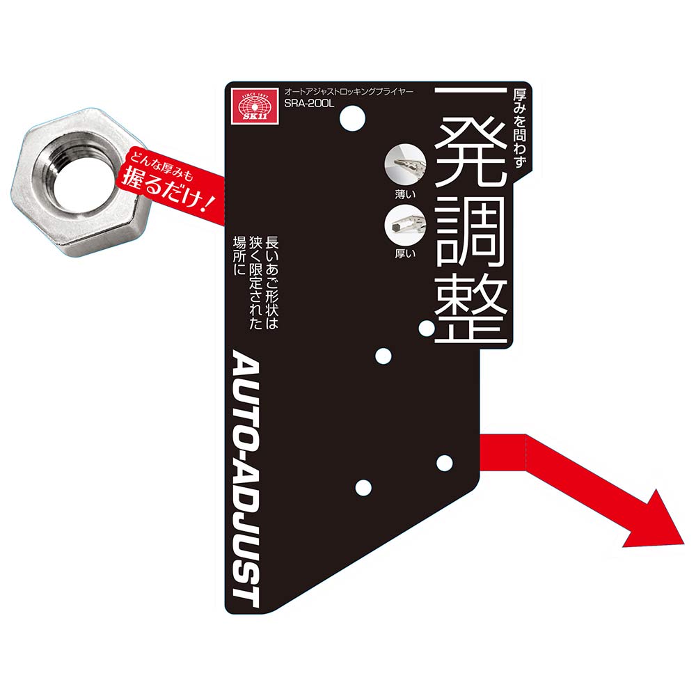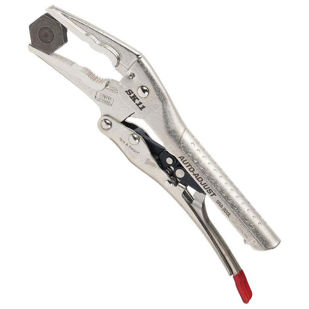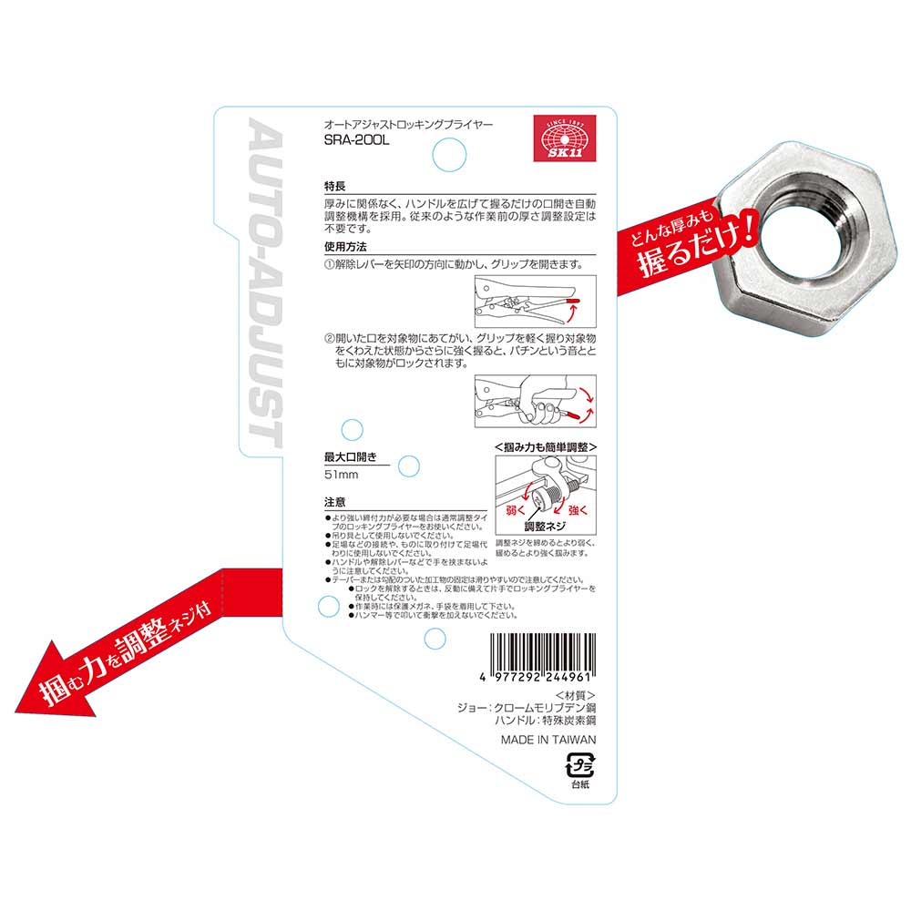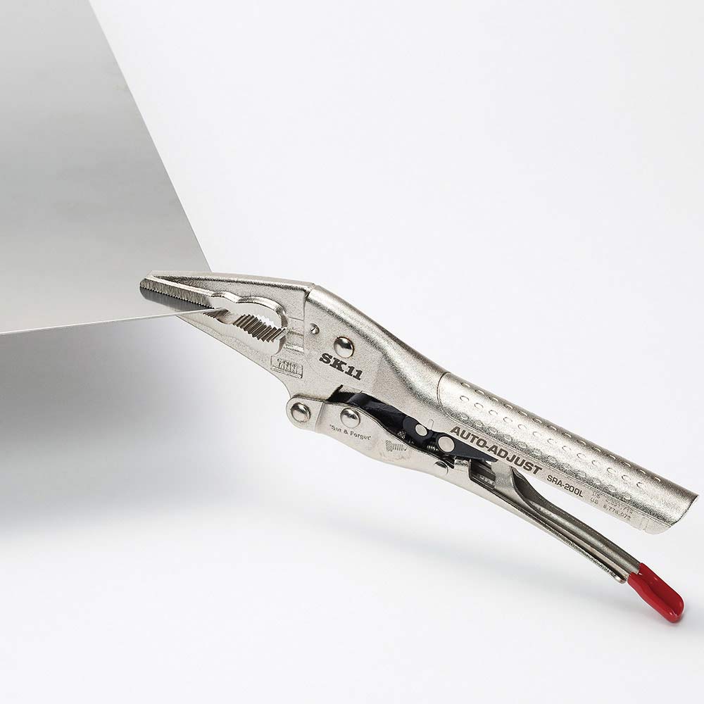 面倒な作業前の厚さ調整は不要、どんな厚みも広げて握るだけの簡単操作できます。 クランプとしての固定作業。 厚みに関係なく、ハンドルを広げて握るだけの口開き自動調整機構を採用、従来のような作業前の厚さ調整設定は不要です。 長いあご形状のため狭く限定された場所に最適です。 小ねじやボルトをつかんで回すことができます。 ●全長:202mm。 ●最大口開き:51mm。