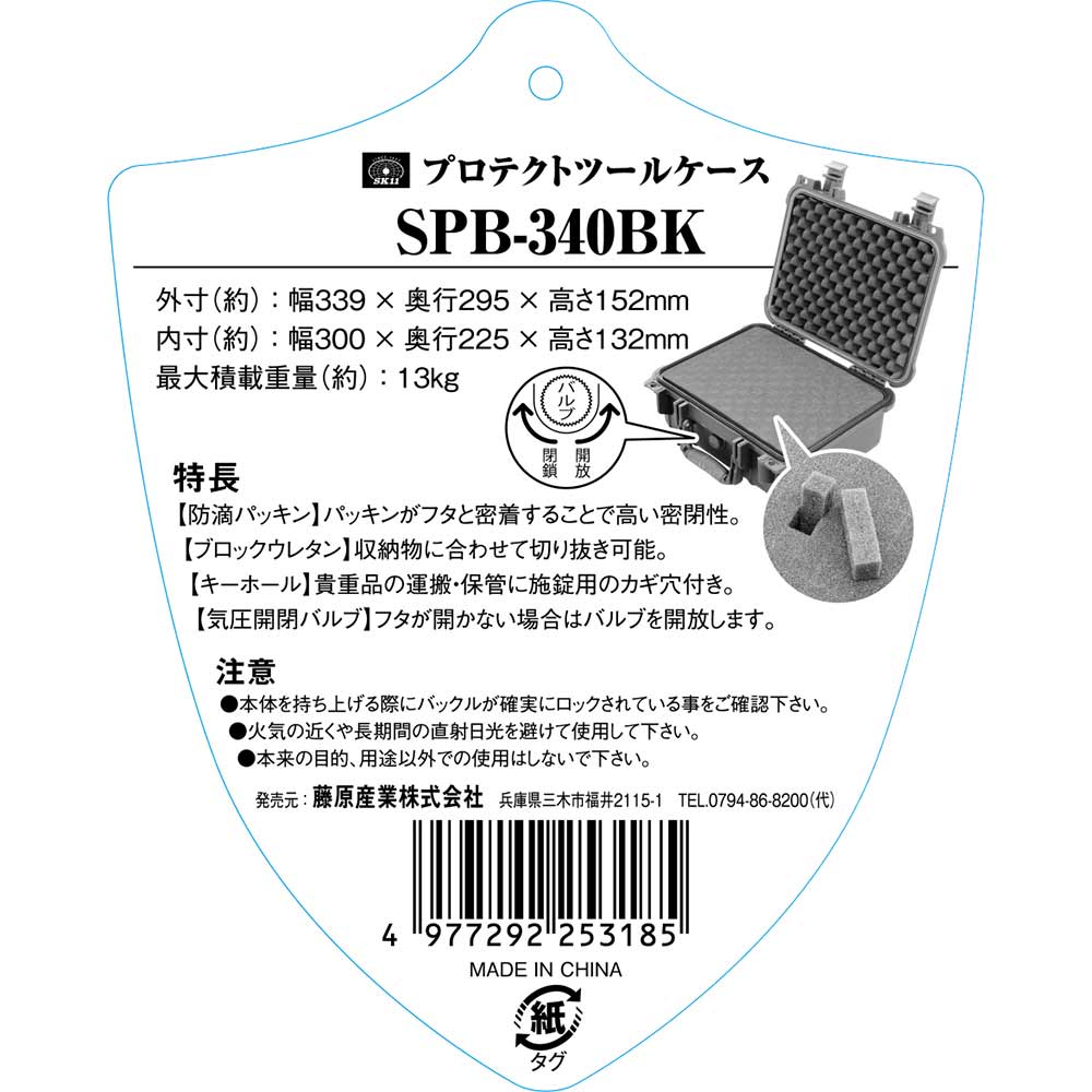 水やホコリから大切な道具をガードします。 道具の収納・保護。 高耐久・高密閉で大切な道具を保護します。 パッキンがフタと密着することで高い密閉性になります。 収納物に合わせて切抜き可能なブロックウレタンです。 貴重品の運搬や保管に施錠用のカギ穴付きです。 気圧開閉バルブ機能付きです。 ●外寸(約):幅339×奥行295×高さ152mm。 ●内寸(約):幅300×奥行225×高さ132mm。 ●最大積載重量(約):13kg。