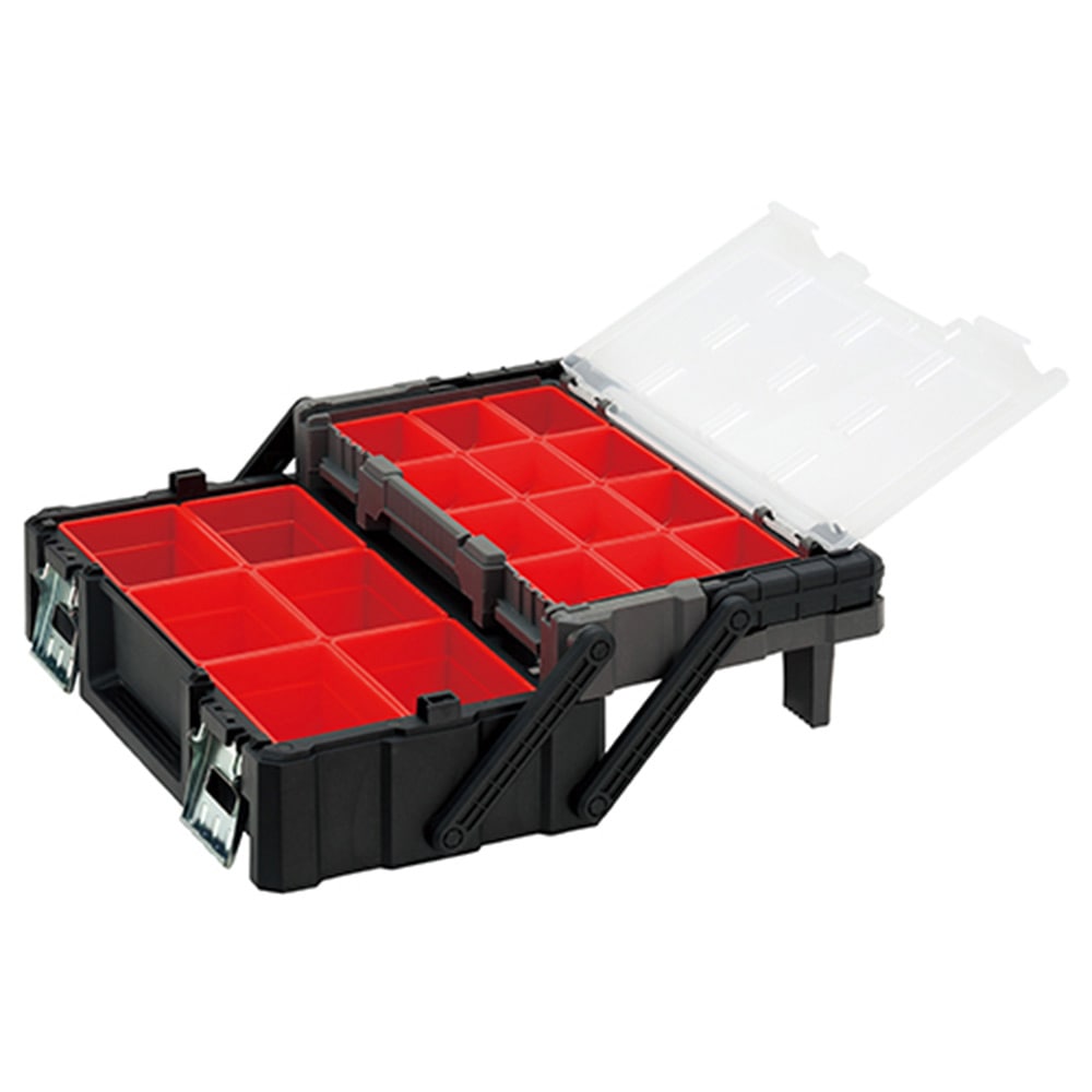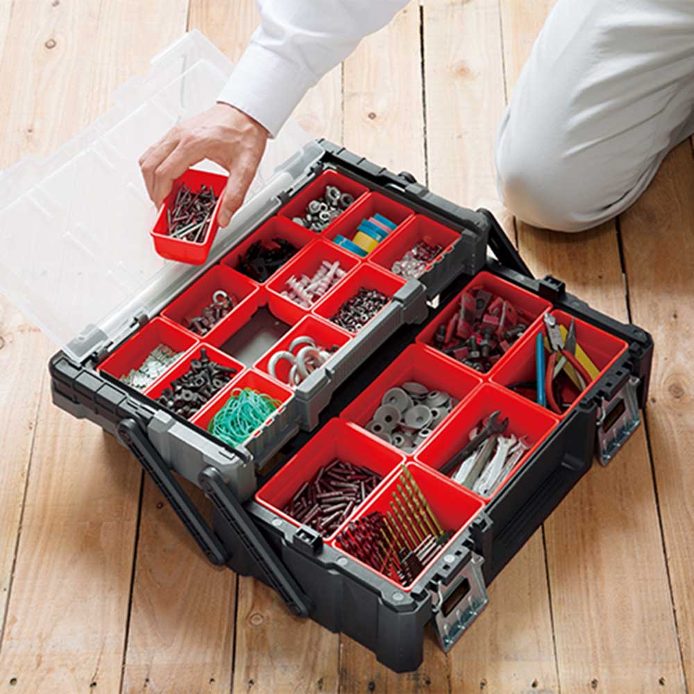パーツの分別収納に便利なボックスです。 小物や道具の収納。 ハンドルを持ち上げるとスライド部が簡易ロックされます。 ハンドルとバックルのダブルロック構造でしっかりロックできます。 上段は小ボックス12個、下段は大ボックス6個で分別収納に最適です。 ●外寸(約):幅460×奥行192×高さ145mm。