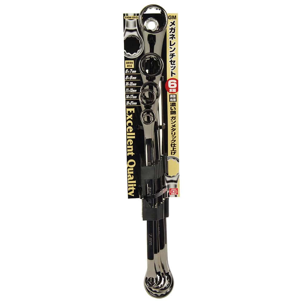濃いツヤ、ガンメタリック仕上げのメガネレンチセットです。 六角ボルト・ナットの締付け、緩め作業。 表面にガンメタリック処理をしているので、キズが付きにくいです。 プロのニーズに対応できる品質・耐久性のあるメガネレンチです。 ●サイズ:6mmX7mm・8mmX9mm・10mmX12mm・11mmX13mm・14mmX17mm・19mmX21mm。 ●セット内容:レンチX6本・ホルダーX1。