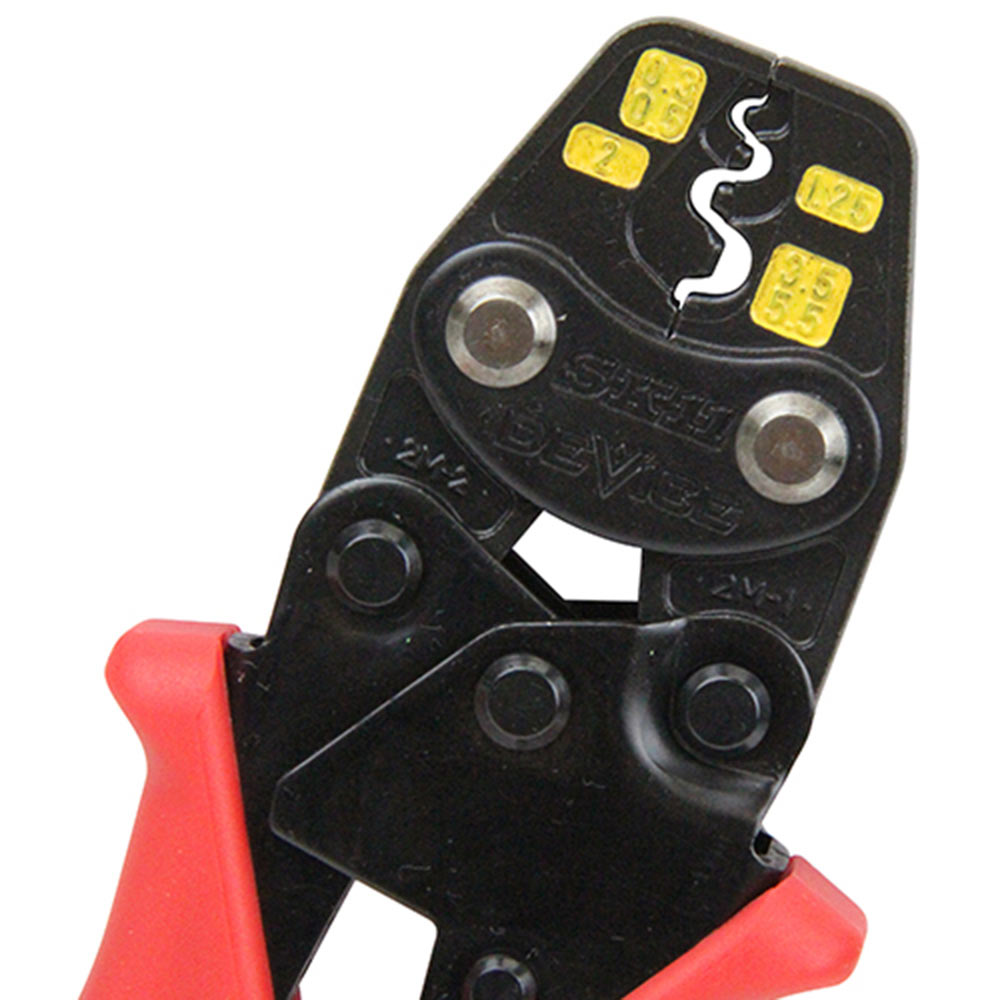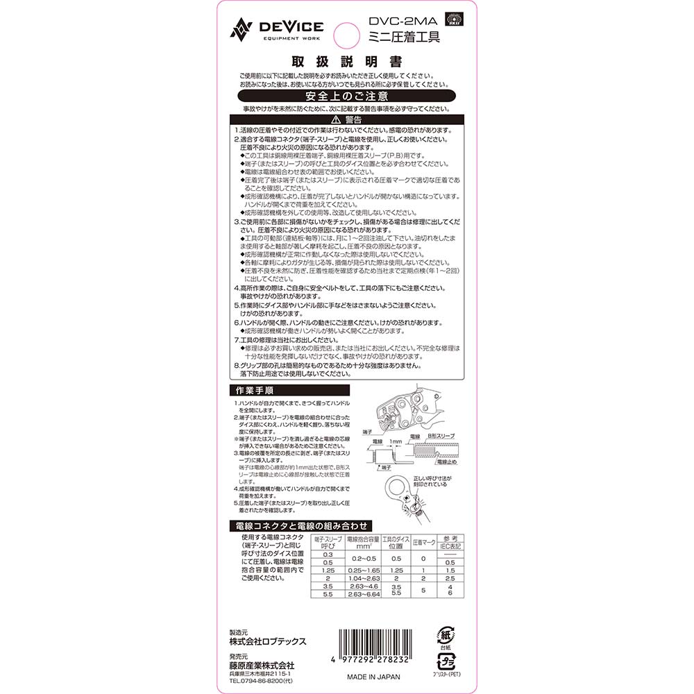 小柄なボディでパワフル圧着、軽量、コンパクト設計で手にフィットするポケットサイズになっています。 銅線用裸圧着端子用・裸圧着スリーブ用(P・B)用。 成形確認機構で圧着不良防止します。 確実に圧着できれば機構が解除されハンドルが開きます。 端子の仮押さえも片手でラクラクです。 圧着完了の端子・スリーブには圧着マークが刻印されます。 ●使用範囲:0.3、0.5、1.25、2、3.5、5.5mm2。 ●全長:172mm。 ●重量:250g。