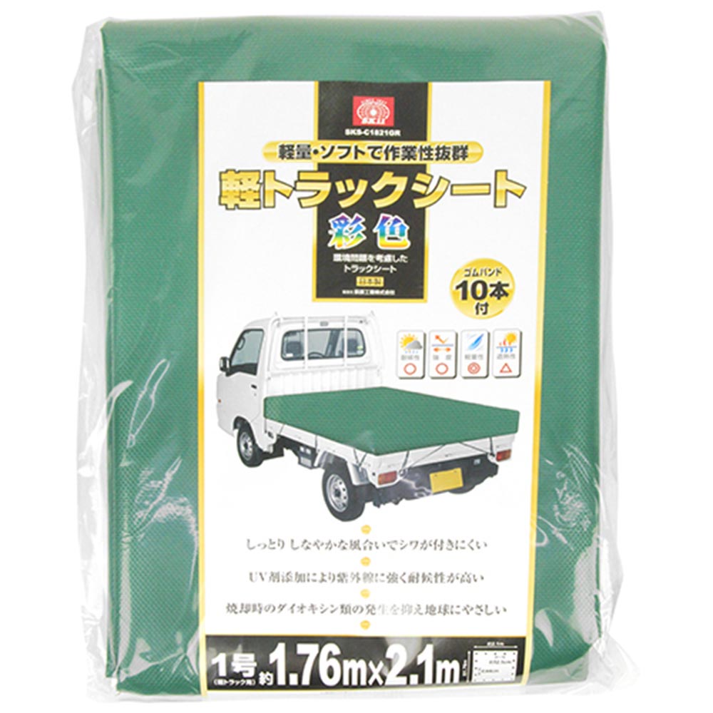 多彩なカラーバリエーションを持つ軽量トラックシートです。 荷物の落下防止や、悪天候等への荷物の濡れを防止。 軽量でしなやかな風合いで扱いやすいです。 焼却時のダイオキシン類の発生を抑え地球にやさしい素材です。 トラックの荷台カバーとして最適です。 UV剤添加により紫外線に強く耐候性が高い仕様です。 ●シート本体寸法:1760mm×2100mm。 ●ゴムバンド10本付。 ●カラー:グリーン。 ●1号・軽トラック用平張りタイプ。