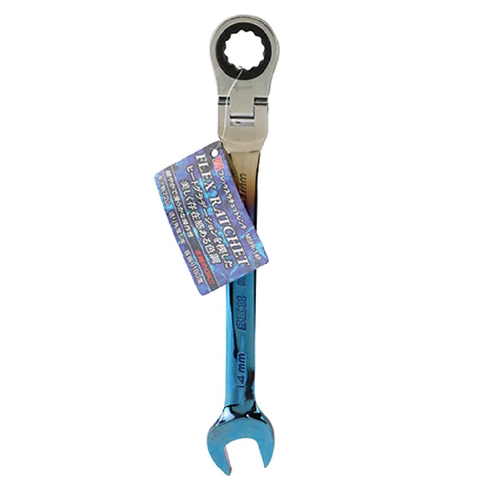 細やかで滑らかな操作性のフレックスラチェットレンチです。 六角ボルト・ナットの締付け、緩め作業。 ヒートグラデーションを模した、美しく存在感のある色調です。 首振り機構は0~180度の任意の角度に設定でき、障害物を避けての作業が可能です。 本締めが可能です。 ●サイズ:14mm。 ●ギア数:72山(送り角度5度)。 ●首振り機構付。 ●使用トルク:ラチェット158N・m以下、スパナ86N・m以下。