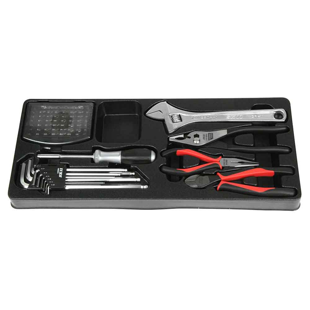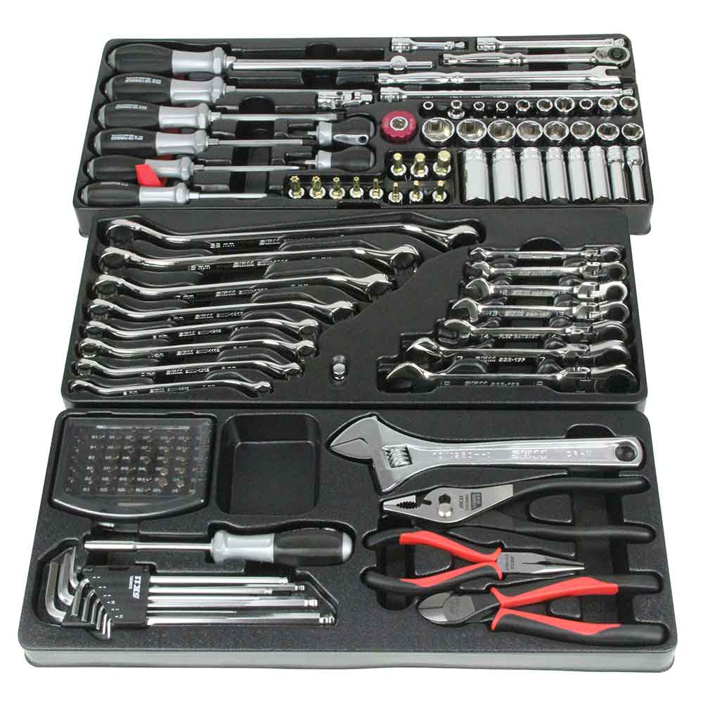入組点数は充実の133点、厳選したこだわりのツールをセットしました。 各種メンテナンス作業。 ●工具箱(上部):(内寸)550×235×90mm・具箱(引出し上2段):(内寸)550×210×50mm。 ●セット内容:9.5sqソケット(6・7・8・9・10・11・12・13・14・15・16・17・18・19・21・22・24mm)。 ●セット内容:9.5sqビットアダプターソケット・9.5sqヘックスローブソケット(T25・T30・T40・T45・T50)。 ●セット内容:9.5sqディープソケット(8・10・12・13・14・17・19・21mm)・9.5sqヘックスビットソケット(4・5・6・8・10・12mm)・9.5sqコンパクトラチェットハンドル190mm・9.5sqスピナーハンドル250mm。 ●セット内容:9.5sqスライドヘッドハンドル200mm・9.5sqラチェットスピンナー・メガネレンチ(8X10・10X12・11X13・12X14・14X17・17X19・19X21・22X24)メガネレンチアダプタービット用・ビットドライバーハンドル。