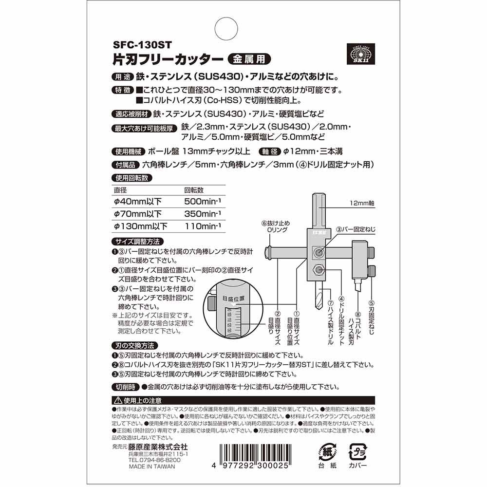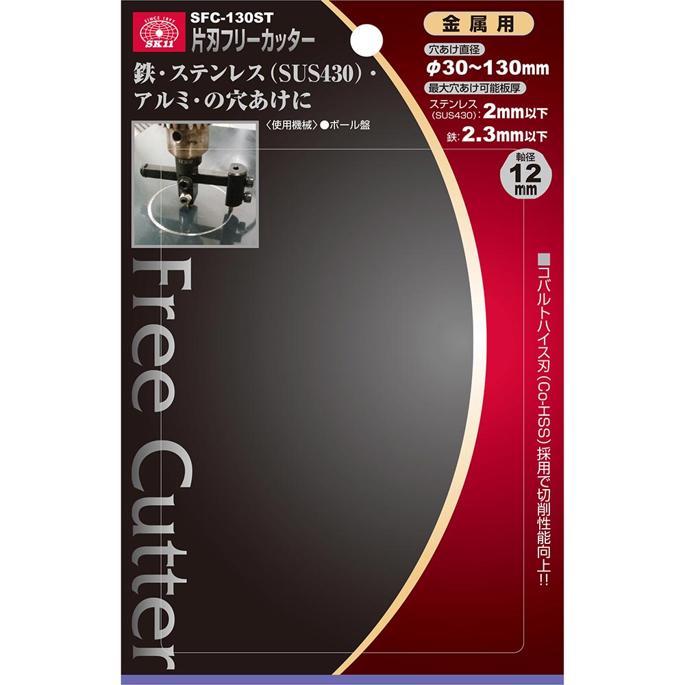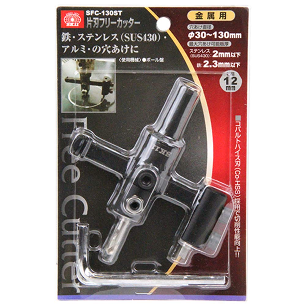 コバルトハイス刃(Co-HSS)採用で、切削性能が向上しました。 鉄・ステンレス(SUS430)・アルミ等の穴あけ。 これひとつで直径30~130mmまでの穴あけが可能です。 ●金属用。 ●適応被削材:鉄・ステンレス(SUS430)・アルミ・硬質塩ビなど。 ●穴あけ直径:30~130mm。 ●最大穴あけ可能板厚:(鉄)2.3mm以下・(ステンレスSUS430)2.0mm以下・(アルミ・硬質塩ビ)5.0mm。 ●軸径:12mm・三本溝。 ●使用機械:ボール盤13mmチャック以上。 ●使用回転数:(直径40mm以下)500min-1・(直径70mm以下)350min-1・(直径130mm以下)110min-1。 ●付属品:六角棒レンチ5mm・六角棒レンチ3mm(ドリル固定ナット用)。