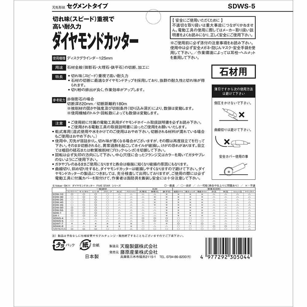 脅威の切断距離180m、スピード重視のセグメント形状のダイヤモンドカッターです。 石材全般(御影石・大理石・鉄平石)の切断作業。 刃先セグメント形状で切れ味(スピード)重視設計です。 石材の切断に最適なダイヤモンドチップを採用しており、抜群の耐久性と切れ味が得られます。 切り粉の排出が良く作業能率がアップします。 ●外径:125mm。 ●内径:22mm(20mm)。 ●刃厚:2.2mm。 ●ダイヤ幅:7.0mm。 ●最高回転速度:12200min-1。 ●乾式専用。 ●使用機種:ディスクグラインダー125mm。