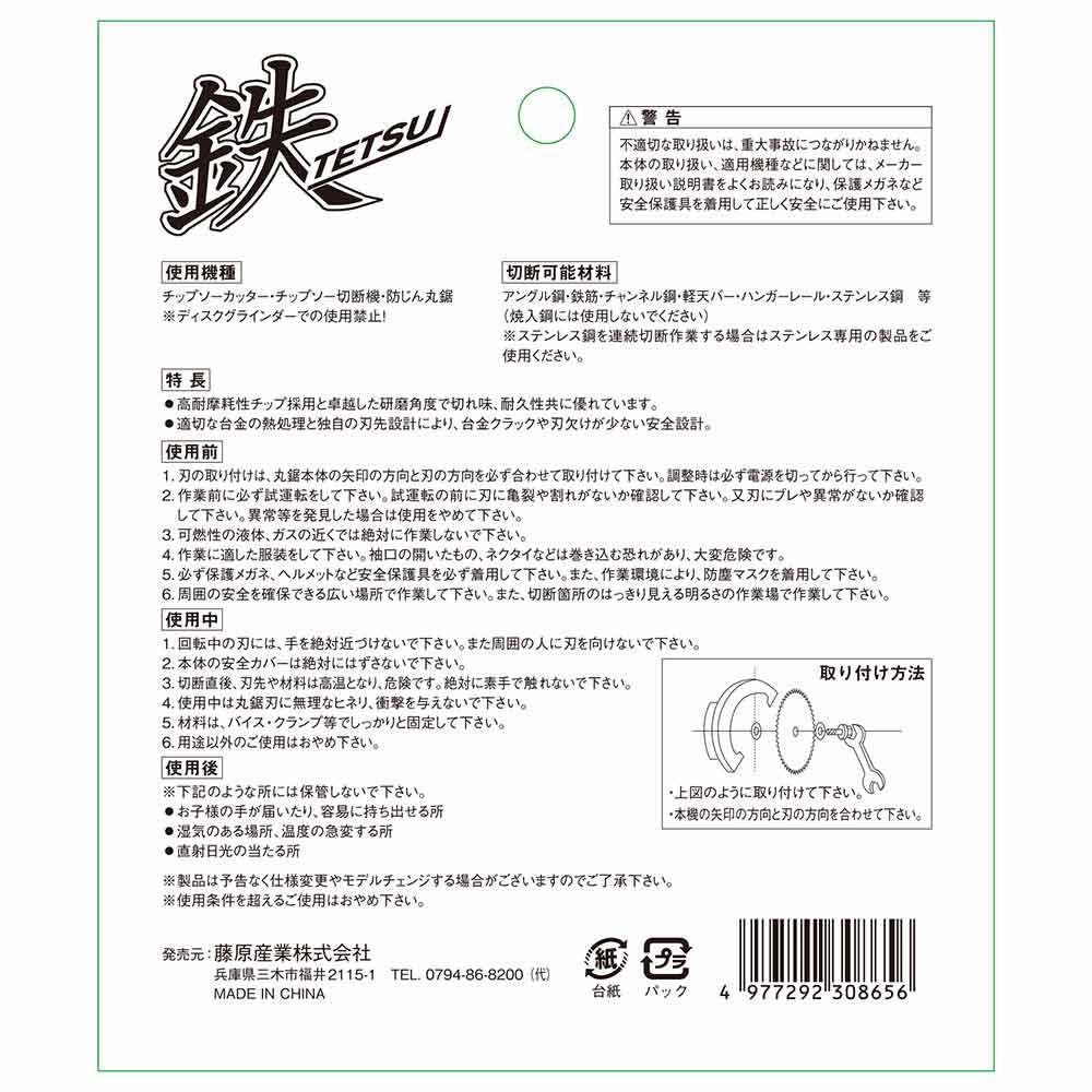 焼入鋼には使用しないでください。 ステンレス鋼を連続切断作業する場合はステンレス専用の製品をご使用ください。