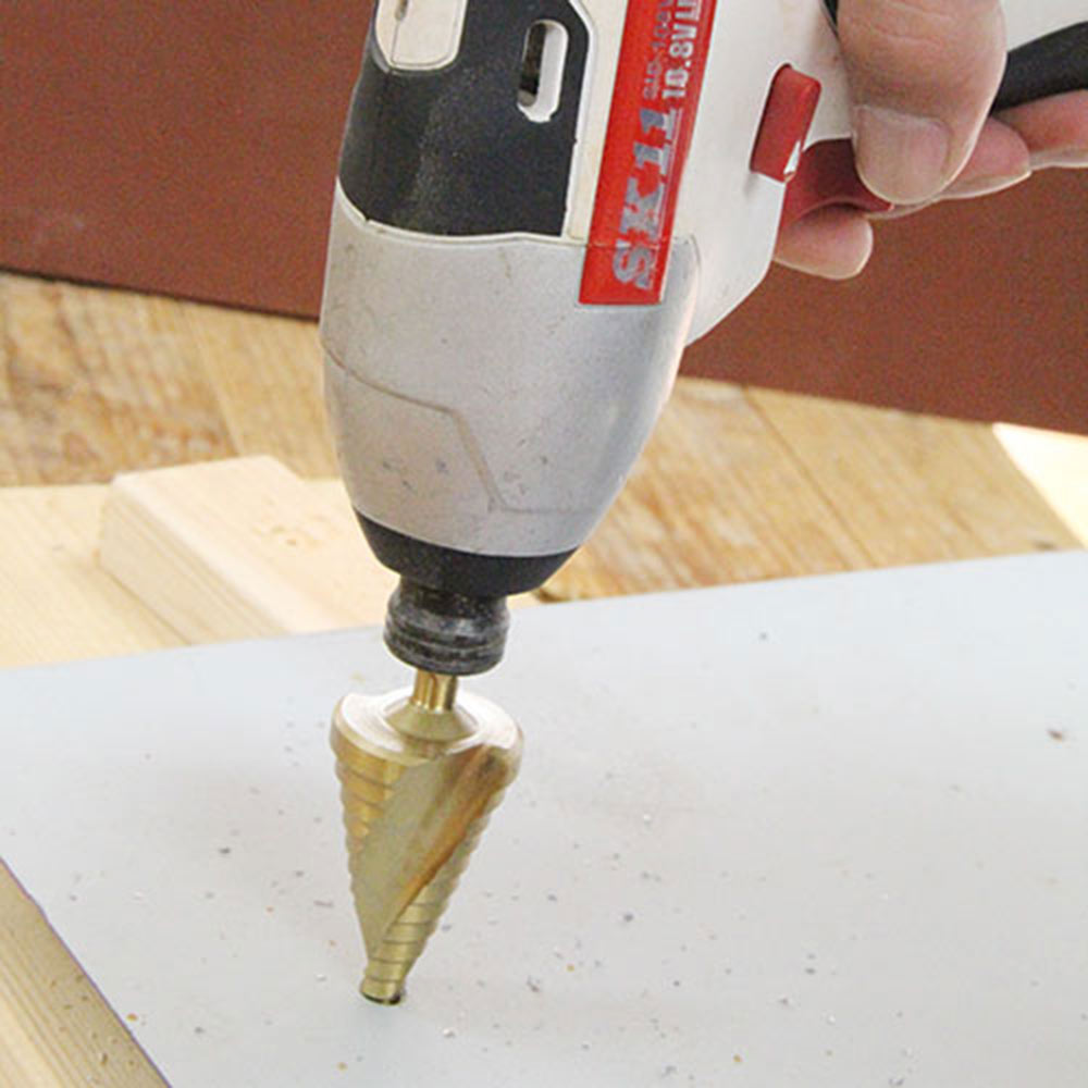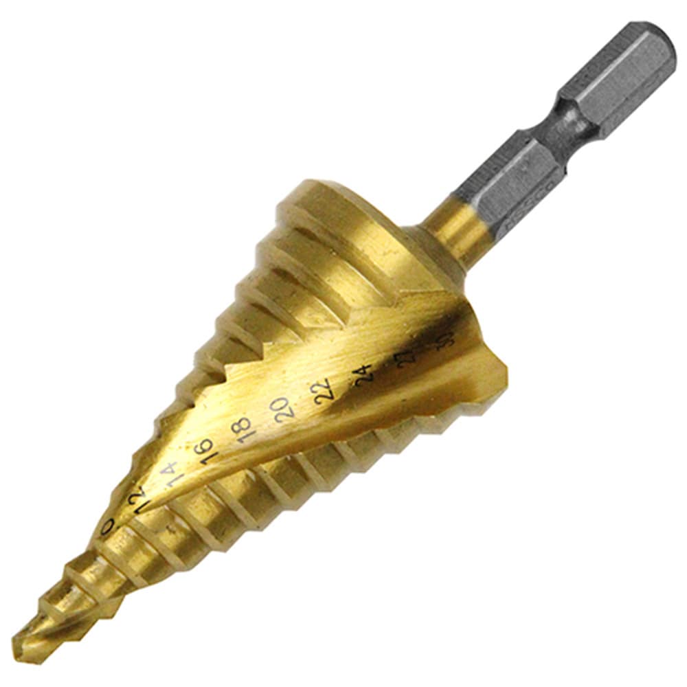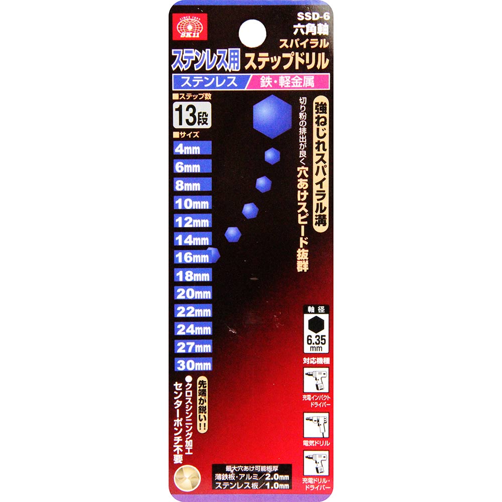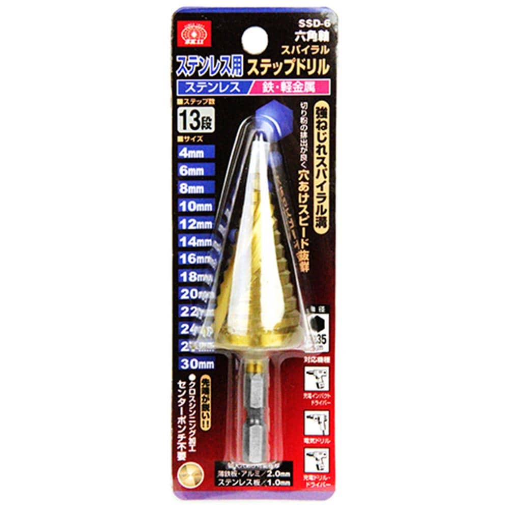 強ねじれスパイラル溝設計により、切り粉の排出が良く穴あけスピード抜群です。 ステンレス板・薄鉄板(一般鋼)・アルミなどの穴あけ・穴拡大・バリ取り作業。 独自の刃先角度設計により切削抵抗を軽減し、バッテリー効率が良く充電インパクトドライバーでの使用に最適です。 刃先シンニング加工により、材料への食いつきが良くセンターポンチ不要です。 チタンコーティング仕様により耐熱性に優れ、長寿命です。 ●サイズ:4・6・8・10・12・14・16・18・20・22・24・27・30mm。 ●6.35mm六角軸。 ●段数:13段。 ●最大穴あけ可能板厚:薄鉄板、アルミ2.0mm以下。 ●最大穴あけ可能板厚:ステンレス板1.0mm以下。 ●対応機種:充電インパクトドライバー・充電ドリルドライバー・電気ドリル。