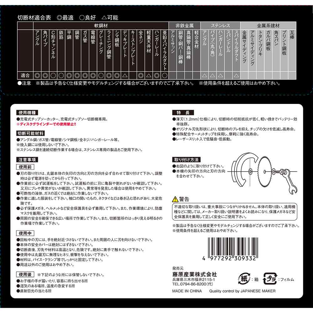 刃厚1.2mmと薄刃仕様により、切断時抵抗を軽減しバッテリー効率抜群です。 鉄筋や全ネジなどの切断作業。 オリジナル刃先形状により、切断時のブレを抑え、チップの欠けを低減し高寿命です。 特殊配合サーメットチップを採用し、摩耗に強く高寿命です。 レーザースリット入りで低騒音・低振動です。 ●サイズ:110mm。 ●刃数:24P。 ●刃厚:1.2mm。