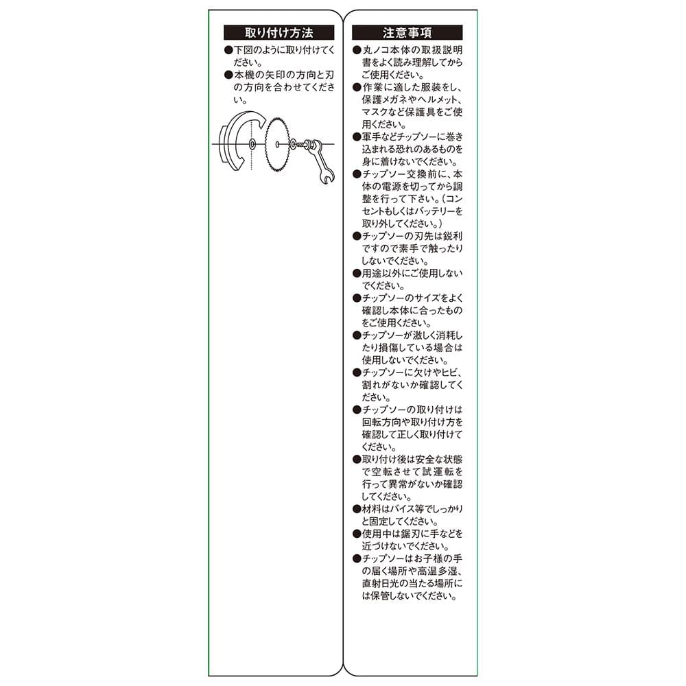 刃の取り付けは、丸鋸本体の矢印の方向と刃の方向を必ず合わせて取り付けてください。 保護メガネ・ヘルメット・防塵マスクを着用して作業をして下さい。 回転中の刃には絶対に手を近づけないでください。
