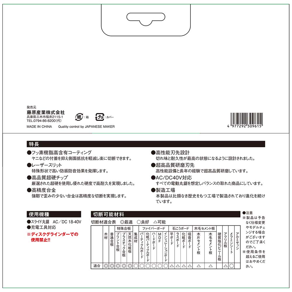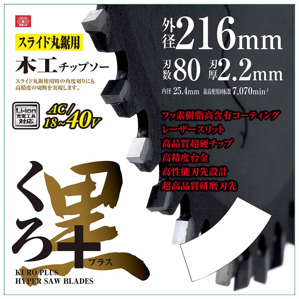 傾斜切断作業において高精度切断を実現、滑りが違うから軽さが違います。 スライド丸鋸用の木工チップソー。 高含有量フッ素樹脂コーティングにより滑りが違います。 強靭で平らな台金を使用し、精度ある快適な切断を実現しました。 シャープな刃先エッジで切削抵抗を20パーセント軽減しています。 レーザースリット&非硬化特殊ボンド使用により、静振・静音効果が持続します。 環境に配慮した業界初の次世代チップソーです。 ●外径:216mm。 ●刃厚:2.2mm。 ●内径:25.4mm。 ●刃数:80。 ●フッ素樹脂コーティング。 ●欧州RoHS規格適合品。