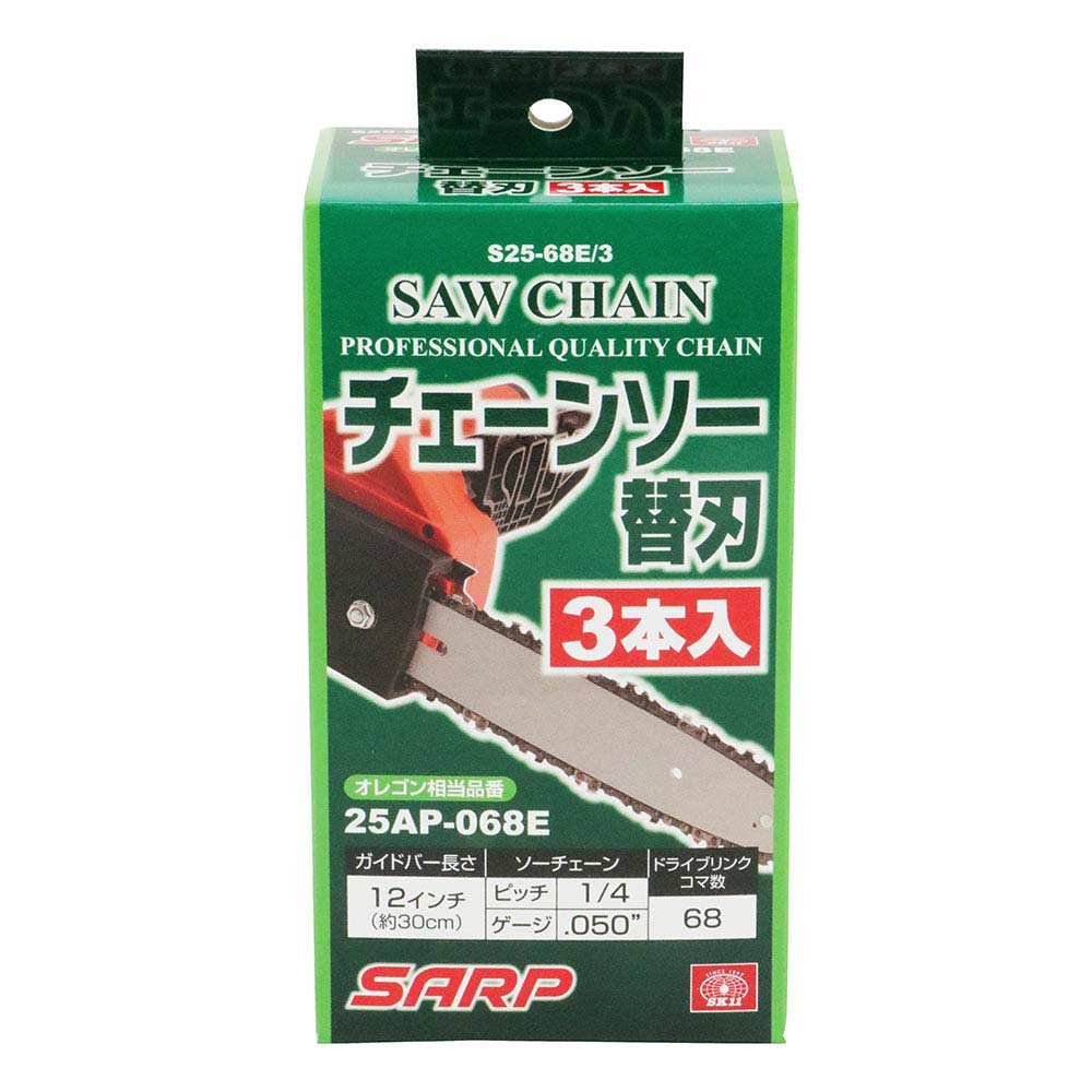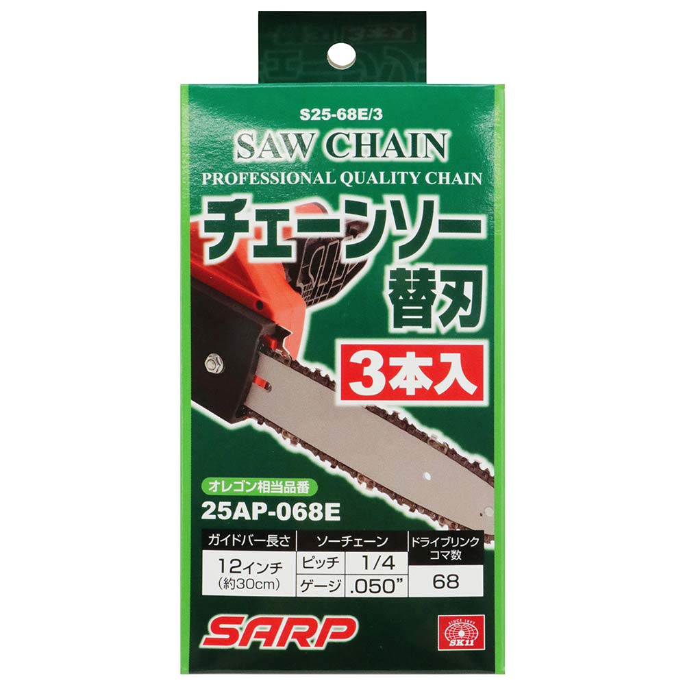 高品質チェーンソー用替え刃のお買い得3本入りです。 エンジンや電動のチェーンソーの交換用の替え刃。 樹木の伐採用替え刃です。 ●相当オレゴン品番:25AP-068E。 ●ガイドバー長さ:12インチ(30cm)。 ●ソーチェーンピッチ:1/4。 ●ソーチェーンゲージ:.050。 ●ドライブリンクコマ数:68。