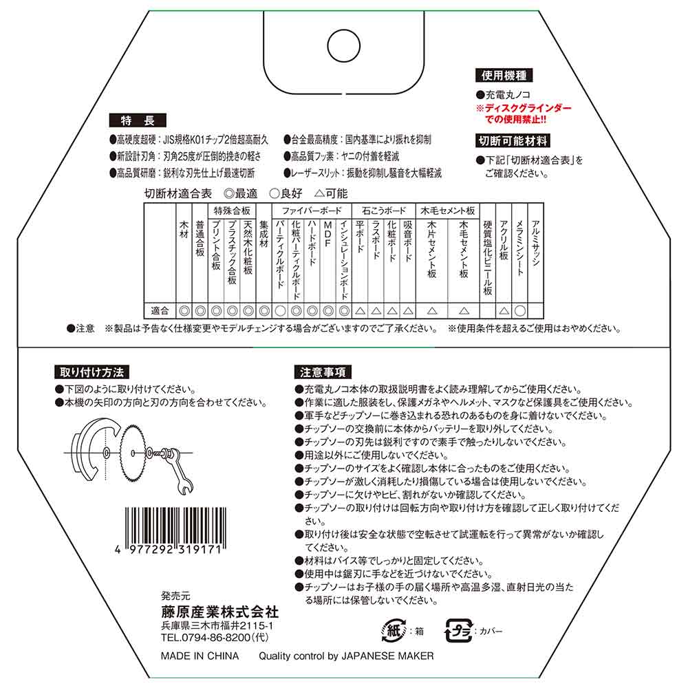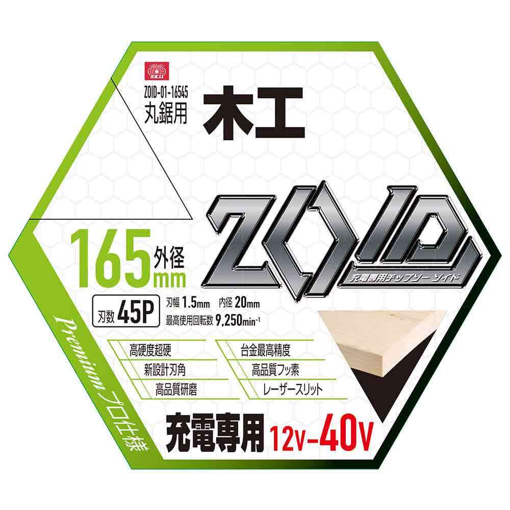 充電丸鋸の為に設計されたニュータイプチップソーで12V-40Vまで対応します。 充電丸鋸等を使用して木材などの切断。 充電丸鋸12~40V専用です。 ●外径:165、刃数:45、刃幅:1.5、内径:20。 ●高硬度超硬JIS規格K01チップを採用、2倍超高耐久を実現。 ●新設計刃角25度が圧倒的挽きの軽さを実現。 ●高品質研磨は鋭利な刃先仕上げにより最速切断を可能にする。 ●台金は最高精度国内基準により振れを抑制する。 ●高品質フッ素でコーティング、ヤニなどの付着を軽減する。 ●レーザースリットは振動を抑制し騒音を大幅軽減する。