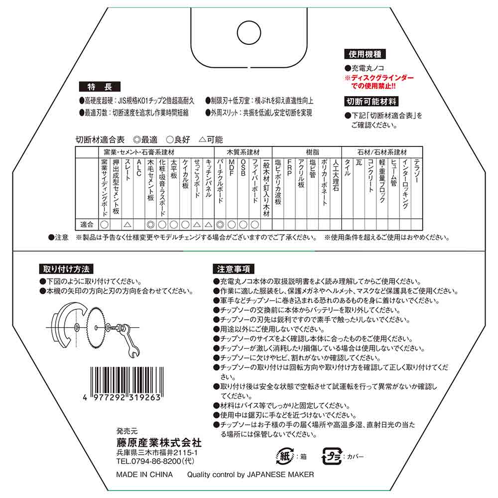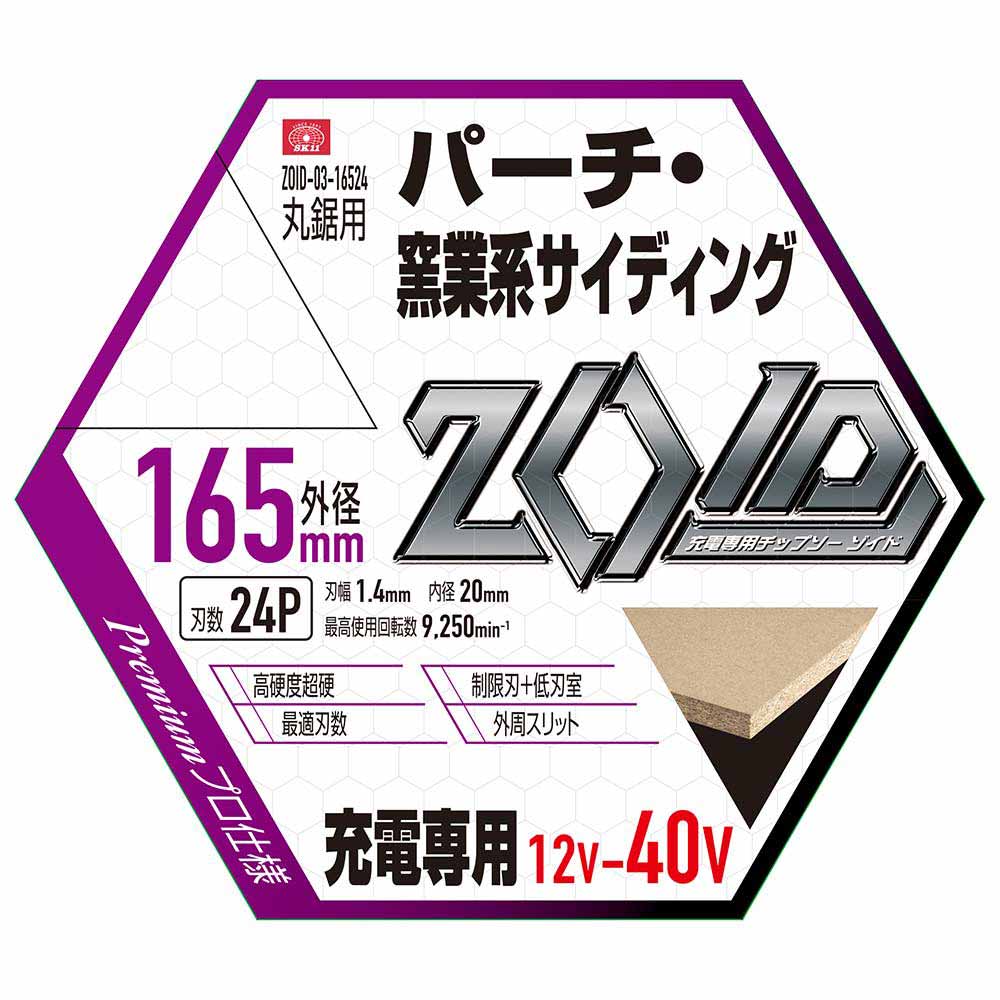 充電丸鋸の為に設計されたニュータイプチップソーで12V-40Vまで対応します。 充電丸鋸等を使用してパーチクルボードや窯業系サイディングの切断。 充電丸鋸12~40V専用です。 ●外径:165、刃数:24、刃幅:1.4、内径:20。 ●高硬度超硬JIS規格K01チップを採用、2倍超高耐久を実現。 ●最適刃数は切断速度を追求し作業時間短縮。 ●制限刃+低刃室は横ぶれを抑え直進性向上する。 ●レーザースリットは振動を抑制し騒音を大幅軽減する。