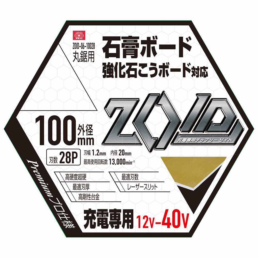 充電丸鋸の為に設計されたニュータイプチップソーで12V-40Vまで対応します。 充電丸鋸等を使用して石膏ボードや強化石こうボード゛の切断。 充電丸鋸12~40V専用です。 ●外径:100、刃数:28、刃幅:1.2、内径:20。 ●高硬度超硬JIS規格K01チップを採用、2倍超高耐久の実現。 ●最適刃厚は強化石膏ボードも安定して切断。 ●高剛性台金は高負荷な切断にも安定して使用できる。 ●最適刃数で重ね切りもスピード切断できる。 ●レーザースリットは振動を抑制し騒音を大幅軽減する。