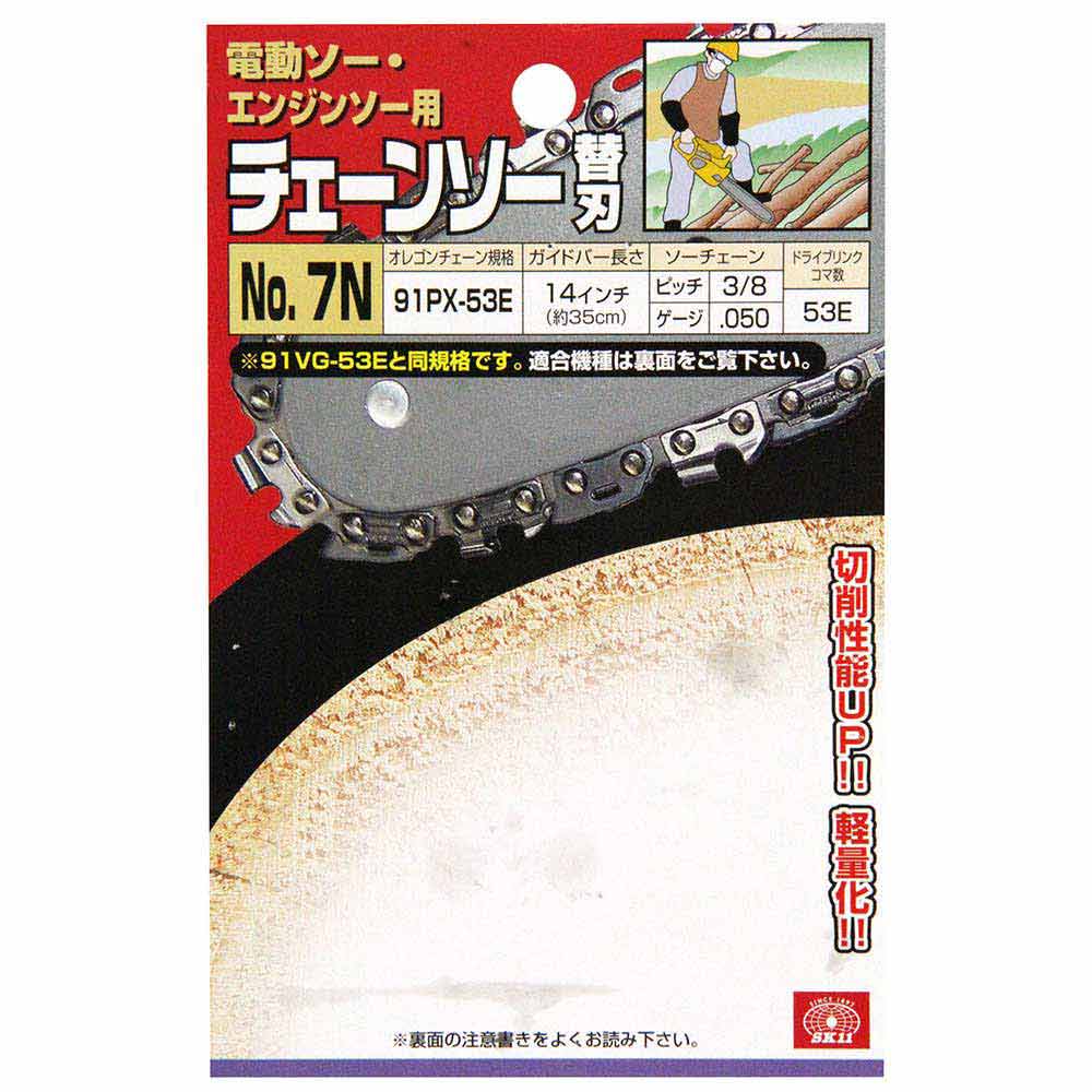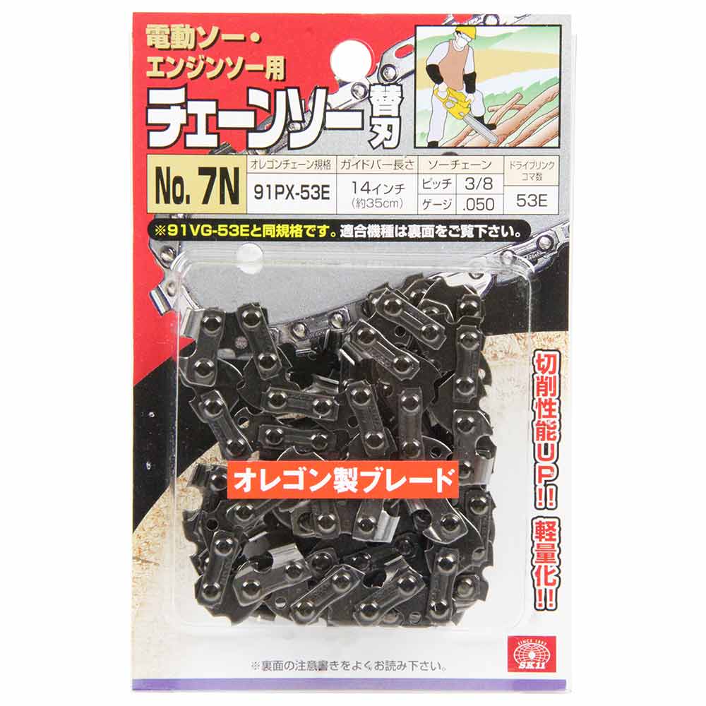 切れ味が鋭く、キックバック軽減機能付き、軽量化チェーンです。 チェーンソー用の交換用替刃。 旧製品91VGに比べ軽量化をはかり、さらに作業効率もアップしました。 キックバックを防ぐバンパータイストラップを廃止し、さらに刃付け法を改良した事で切削性能が9パーセントアップしました(91VGとの比較)。 新設計のバンパードライブリンクによってキックバックを減少させ、米国安全基準のANSI・B175.1に合致してます。 刃持ちが良く、お手入れも簡単なので長くご愛用いただけます。 山林作業や造園作業、趣味の木材加工に適してます。 ●オレゴンチェーン規格:91PX-53E。 ●ガイドバーの長さ:14インチ(約35cm)。 ●ソーチェーン:ピッチ3/8・ゲージ.050。 ●ドライブリンクコマ数:53E。 ●丸ヤスリサイズ:4.0mm(5/32)・3.9mm。 ●アドバンスカット。 ●ブルースチール加工。