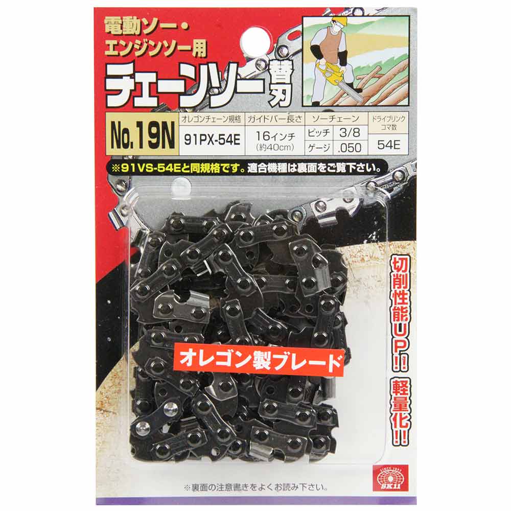 切れ味が鋭く、キックバック軽減機能付き、軽量化チェーンです。 チェーンソー用の交換用替刃。 旧製品91VGに比べ軽量化をはかり、さらに作業効率もアップしました。 キックバックを防ぐバンパータイストラップを廃止し、さらに刃付け法を改良した事で切削性能が9パーセントアップしました(91VGとの比較)。 新設計のバンパードライブリンクによってキックバックを減少させ、米国安全基準のANSI・B175.1に合致してます。 刃持ちが良く、お手入れも簡単なので長くご愛用いただけます。 山林作業や造園作業、趣味の木材加工に適してます。 ●オレゴンチェーン規格:91PX-54E。 ●ガイドバーの長さ:16インチ(約40cm)。 ●ソーチェーン:ピッチ3/8・ゲージ.050。 ●ドライブリンクコマ数:54E。 ●丸ヤスリサイズ:4.0mm(5/32)・3.9mm。 ●アドバンスカット。 ●ブルースチール加工。