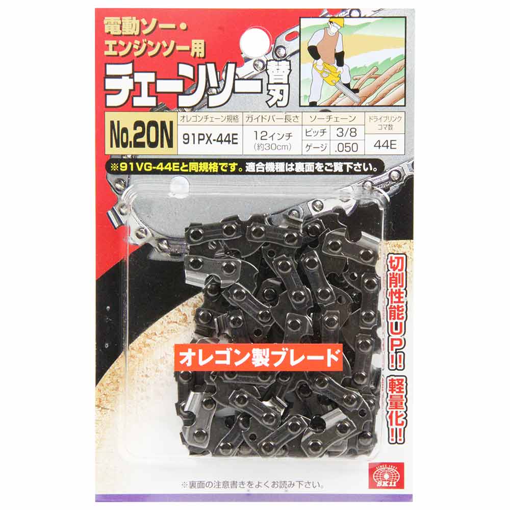 切れ味が鋭く、キックバック軽減機能付き、軽量化チェーンです。 チェーンソー用の交換用替刃。 旧製品91VGに比べ軽量化をはかり、さらに作業効率もアップしました。 キックバックを防ぐバンパータイストラップを廃止し、さらに刃付け法を改良した事で切削性能が9パーセントアップしました(91VGとの比較)。 新設計のバンパードライブリンクによってキックバックを減少させ、米国安全基準のANSI・B175.1に合致してます。 刃持ちが良く、お手入れも簡単なので長くご愛用いただけます。 山林作業や造園作業、趣味の木材加工に適してます。 ●オレゴンチェーン規格:91PX-44E。 ●ガイドバーの長さ:12インチ(約30cm)。 ●ソーチェーン:ピッチ3/8・ゲージ.050。 ●ドライブリンクコマ数:44E。 ●丸ヤスリサイズ:4.0mm(5/32)・3.9mm。 ●アドバンスカット。 ●ブルースチール加工。