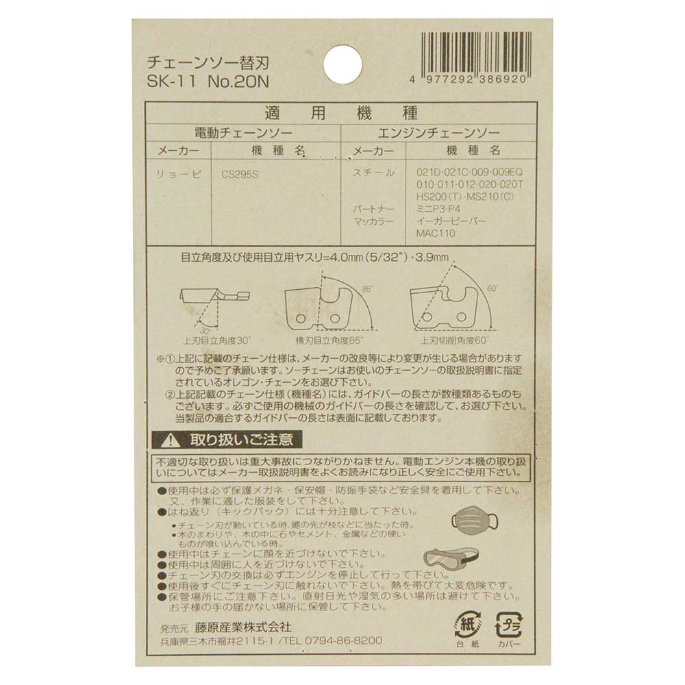 お求めの際は必ず、お持ちの機種のチェーン番号とガイドバーの長さをご確認ください。 チェーン刃の交換は必ずエンジンを停止して行ってください。 使用中は保護メガネ、保安帽、防振手袋など安全具を着用してください。
