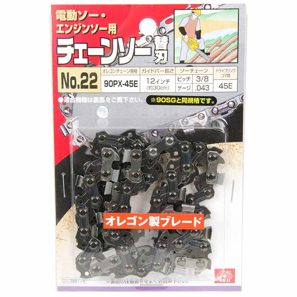 低振動、低反動で扱いやすいチェーンです。 チェーンソー用の交換用替刃。 小型カジュアルソー向けです。 低振動・低キックバックのシャンファーチゼルカッターチェーンです。 ゲージ(.043″)の軽量仕様です。 ●オレゴンチェーン規格:90PX-45E。 ●ガイドバーの長さ:12インチ(約30cm)。 ●ソーチェーン:ピッチ3/8・ゲージ.043。 ●ドライブリングコマ数:45E。 ●丸ヤスリサイズ:4.5mm(11/64)。 ●アドバンスカット。