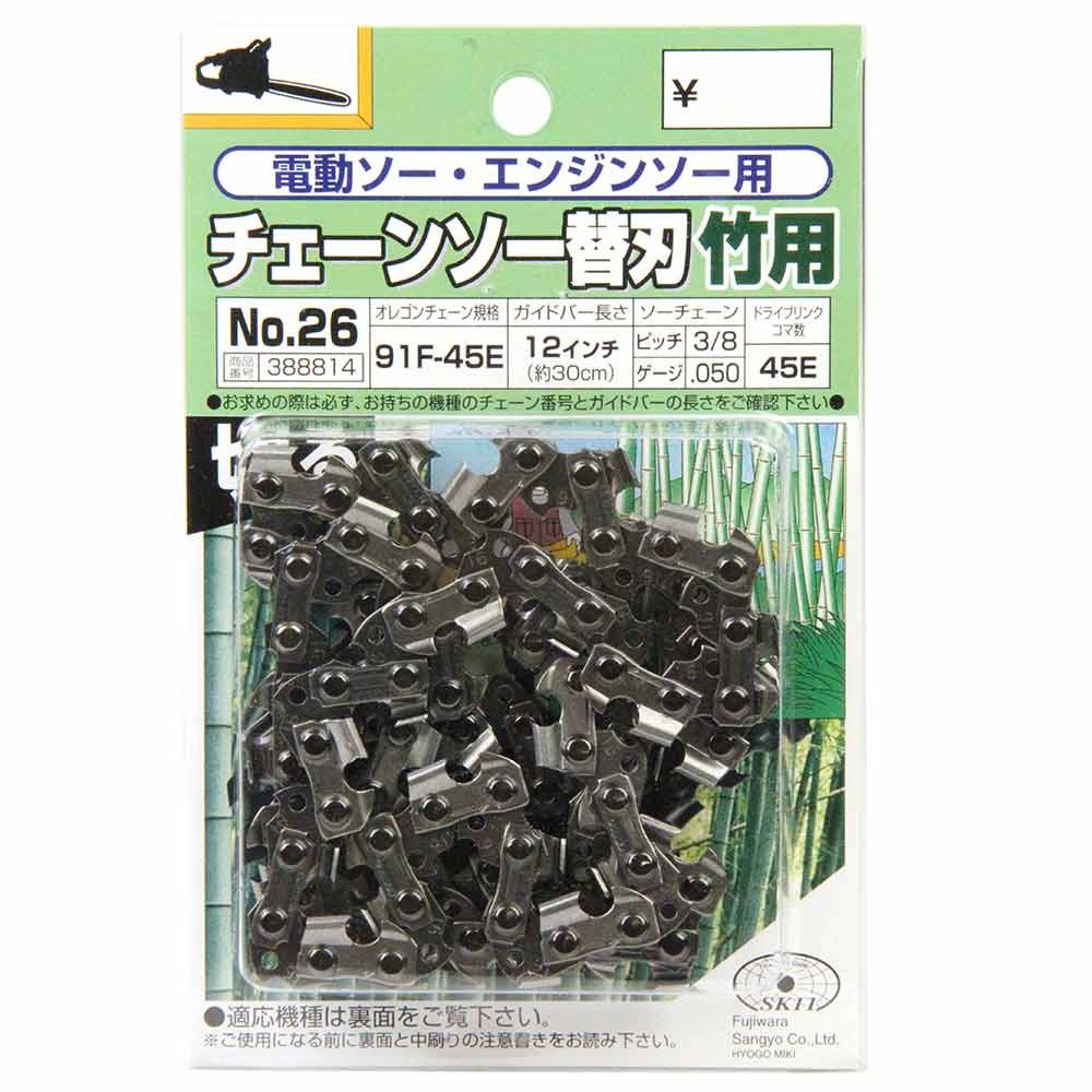 竹や固い木の切断が容易なったフルカッターチェーンです。 チェーンソー用の交換用替刃。 竹などの密集した繊維や硬木の切断に最適です。 91シリーズをベースにしたフルカッターチェーンです。 91ソーチェーンのカッター数を2倍にすることで、固い木の切断が容易になりました、竹切り用としても広く利用されています。 チェーンソーアートのカービング作業にも適したフルカッターチェーンです。 現在91タイプを使用している場合、ガードバーやスプロケットを交換せず使用できます。 ●オレゴンチェーン規格:91F-45E。 ●ガイドバーの長さ:12インチ(約30cm)。 ●ソーチェーン:ピッチ3/8・ゲージ.050。 ●ドライブリンクコマ数:45E。 ●丸ヤスリサイズ:4.0mm(5/32)・3.9mm。 ●スカルプター。