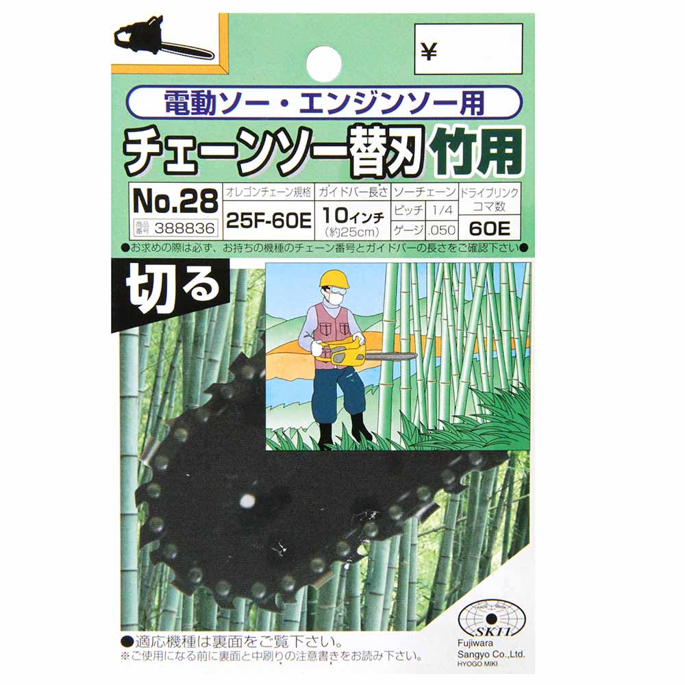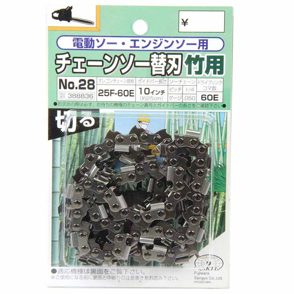 竹などの密集した繊維の切断が容易になったフルカッターチェーンです。 チェーンソー用の交換用替刃。 竹などの密集した繊維や硬木の切断に最適です。 25APをベースにしたフルカッターチェーンです。 25APのカッター数を2倍にすることで、密集した繊維の切断が容易になりました、竹切り用としても広く利用されています。 チェーンソーアートのカービング作業にも適したフルカッターチェーンです。 現在25APを使用している場合、ガードバーやスプロケットを交換せず使用できます。 ●オレゴンチェーン規格:25F-60E。 ●ガイドバーの長さ:10インチ(約25cm)。 ●ソーチェーン:ピッチ1/4・ゲージ.050。 ●ドライブリンクコマ数:60E。 ●丸ヤスリサイズ:4.0mm(5/32)・3.9mm。 ●スカルプター。