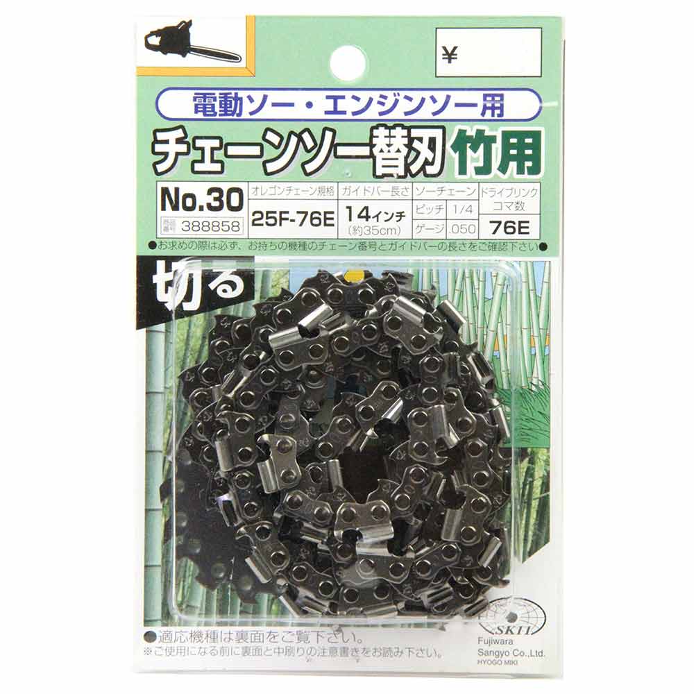 竹などの密集した繊維の切断が容易になったフルカッターチェーンです。 チェーンソー用の交換用替刃。 竹などの密集した繊維や硬木の切断に最適です。 25APをベースにしたフルカッターチェーンです。 25APのカッター数を2倍にすることで、密集した繊維の切断が容易になりました、竹切り用としても広く利用されています。 チェーンソーアートのカービング作業にも適したフルカッターチェーンです。 現在25APを使用している場合、ガードバーやスプロケットを交換せず使用できます。 ●オレゴンチェーン規格:25F-76E。 ●ガイドバーの長さ:14インチ(約35cm)。 ●ソーチェーン:ピッチ1/4・ゲージ.050。 ●ドライブリンクコマ数:76E。 ●丸ヤスリサイズ:4.0mm(5/32)・3.9mm。 ●スカルプター。