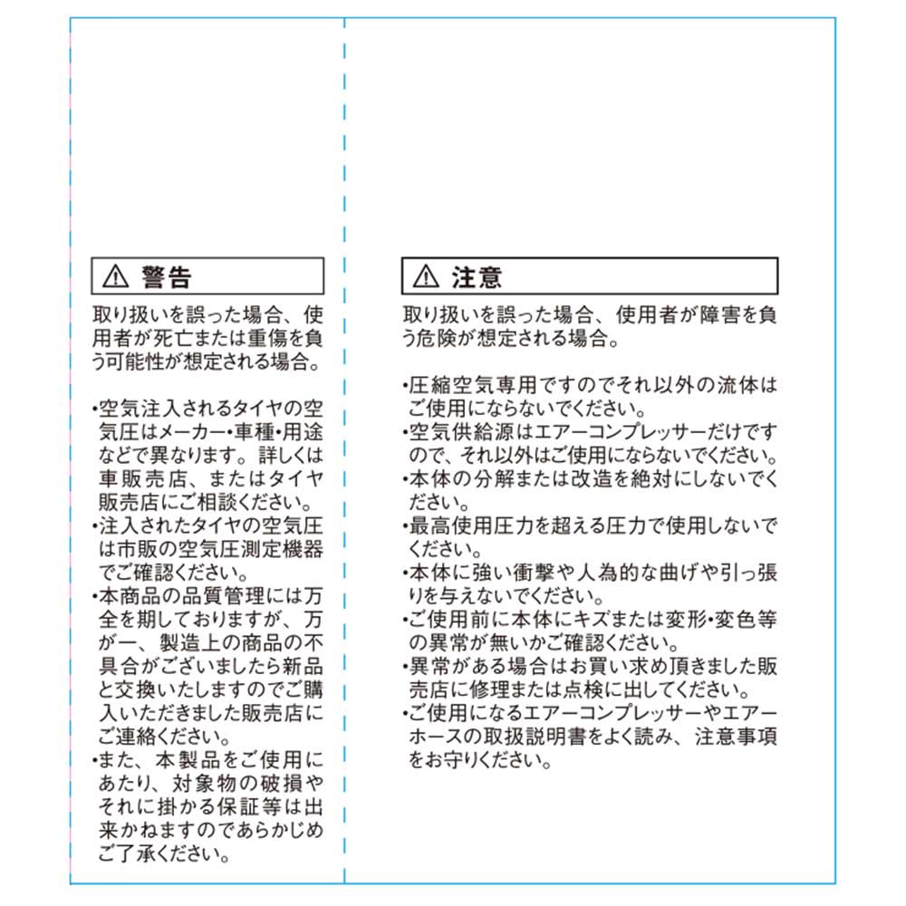 空気注入されるタイヤの空気圧はメーカー・車種・用途などで異なりますので、詳しくは車販売店、またはタイヤ販売店にご相談ください。 注入されたタイヤの空気圧は市販の空気圧測定機器でご確認ください。 エア(圧縮空気)専用です。それ以外の流体で使用しないでください。必ず最高使用圧力以下でご使用ください。