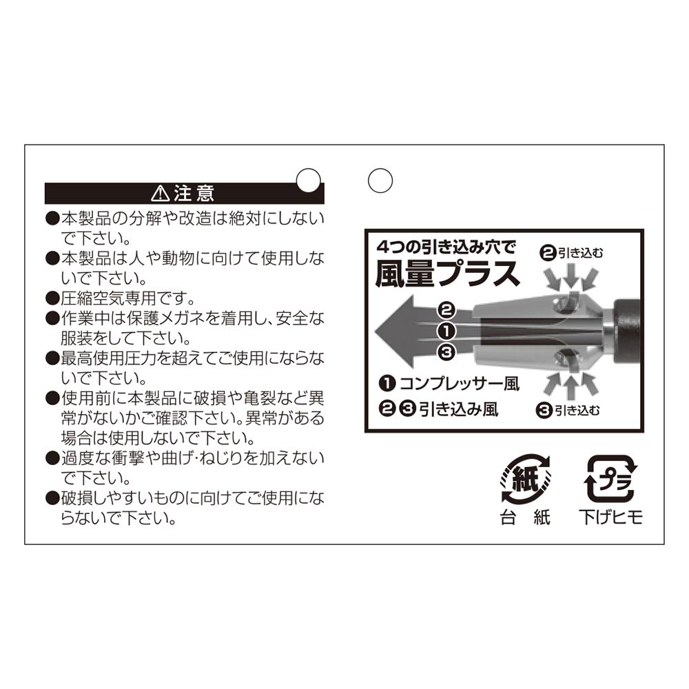 飛散物に注意して、周囲に気をつけて作業をして下さい。 作業中は必ず保護メガネを着用してください。 圧縮空気専用です。