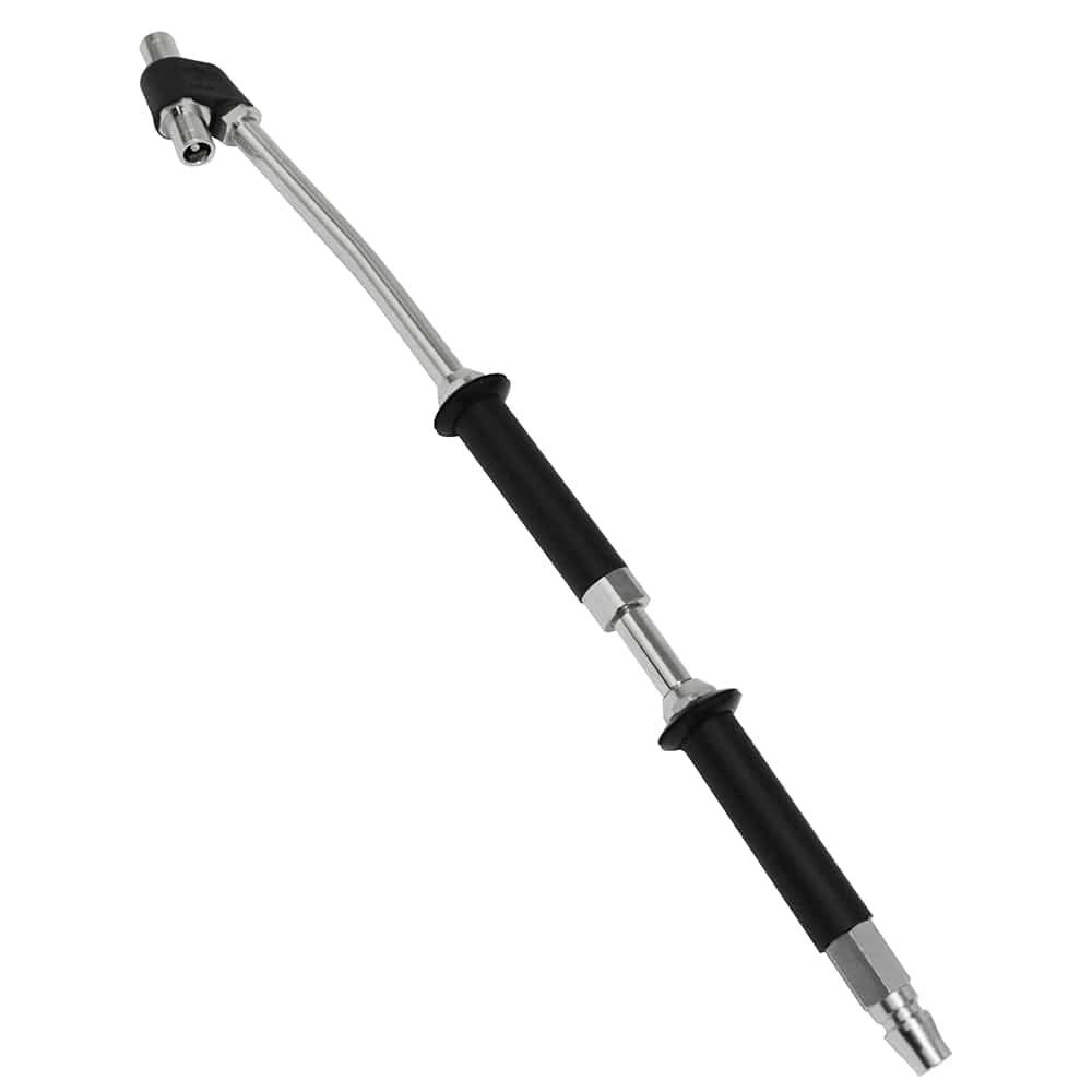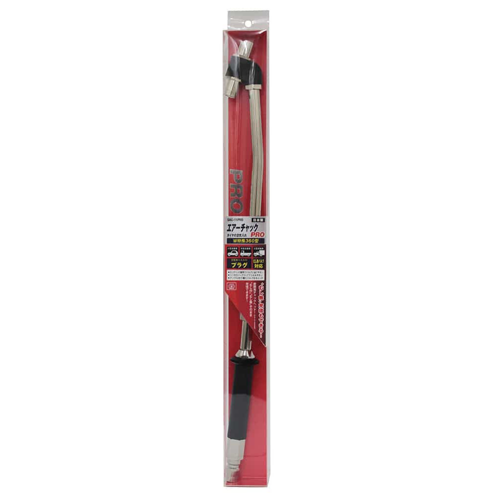特殊ヘッド機構でむし無しのバルブにも注入可能なエアーチャックです。 圧縮空気を自動車やバイクのタイヤに注入するエアコンプレッサー用タイヤチャック。 自動車やバイクなど米式バルブのタイヤの空気を注入します。 特殊チャックヘッド機構(実用新案登録第3165288号)でむし無しのバルブにも注入可能です。 トラックなどのダブルタイヤにも注入可能な角度付きダブルヘッドです。 掴みやすいツバ付きラバーグリップです。 ●適応車種:小型~大型自動車。 ●対応バルブ:米式バルブ。 ●空気取入口:汎用ワンタッチプラグ。 ●最高使用圧力:1.0MPa。 ●常用圧力:0.8MPa。 ●適応形状:シングル・ダブルタイヤ対応型。 ●全長:390mm。 ●重量:230g。