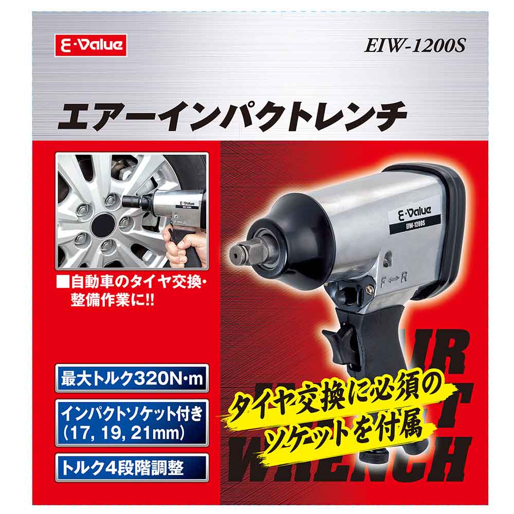 自動車のタイヤ交換・整備作業に便利です。 ボルト・ナットの締付・緩め作業。 最大トルク320N・mの強い力でスピーディーに作業ができます。 タイヤ交換時に必要な17mm・19mm・21mmのインパクトソケットを付属しています。 トルクは4段階の調整が可能です。 ●ハンマー機構:シングルハンマー。 ●ソケット差込角:アンビル12.7mm角(1/2sq)。 ●無負荷回転数:7000min-1。 ●空気使用量:140L/min。 ●空気取り入れ口:Rc1/4(PT1/4めねじ)。 ●能力最大トルク:320N・m。 ●使用適正空気圧力:0.6~0.7MPa。 ●セット内容:本体・インパクトソケット(17・19・21mm)・エア用ワンタッチプラグ(R1/4おねじ)・エアーツールオイル・シールテープ。