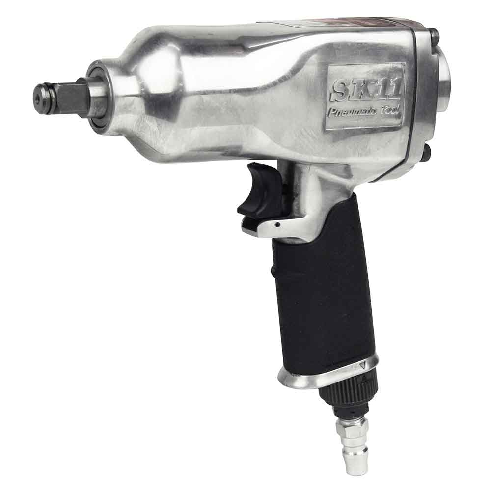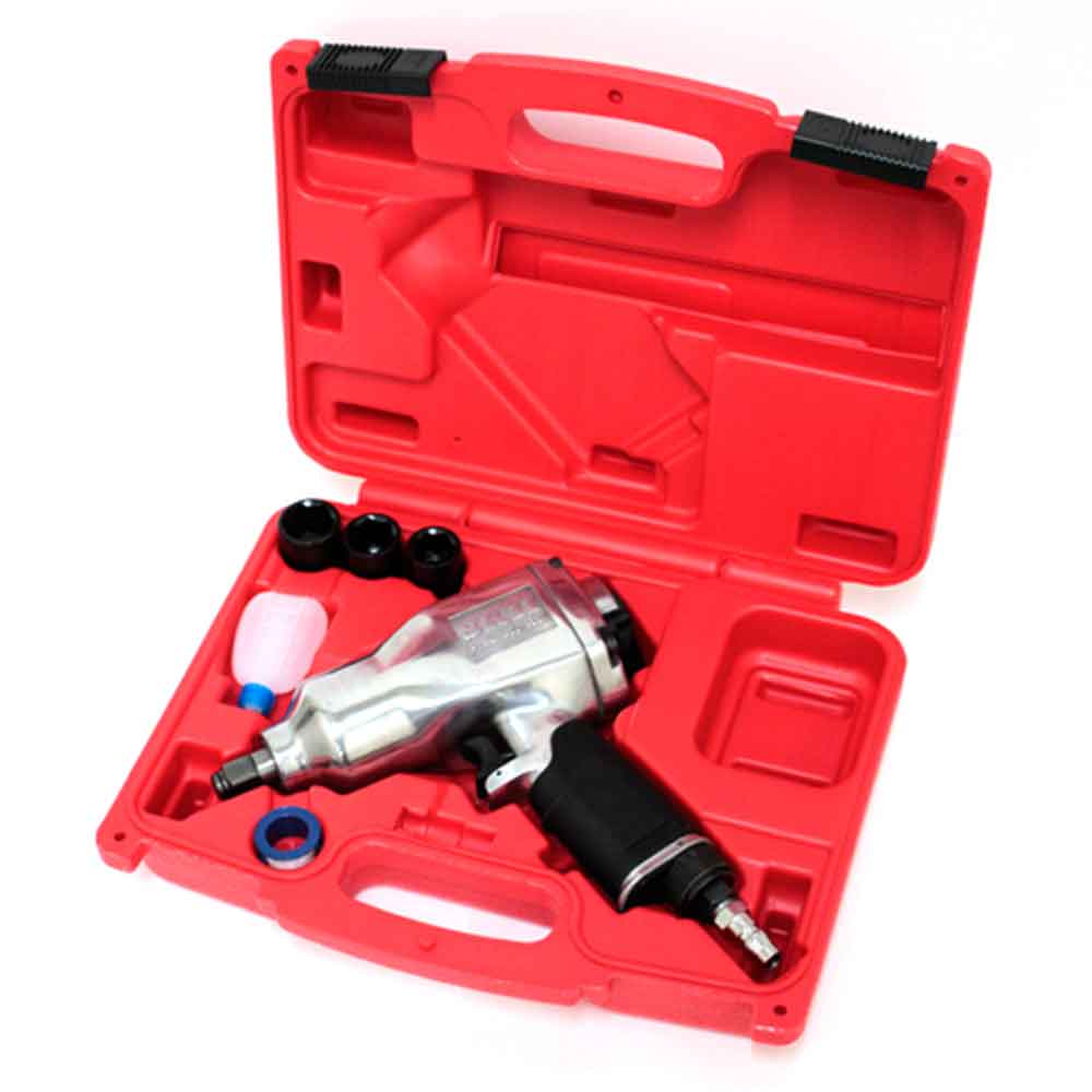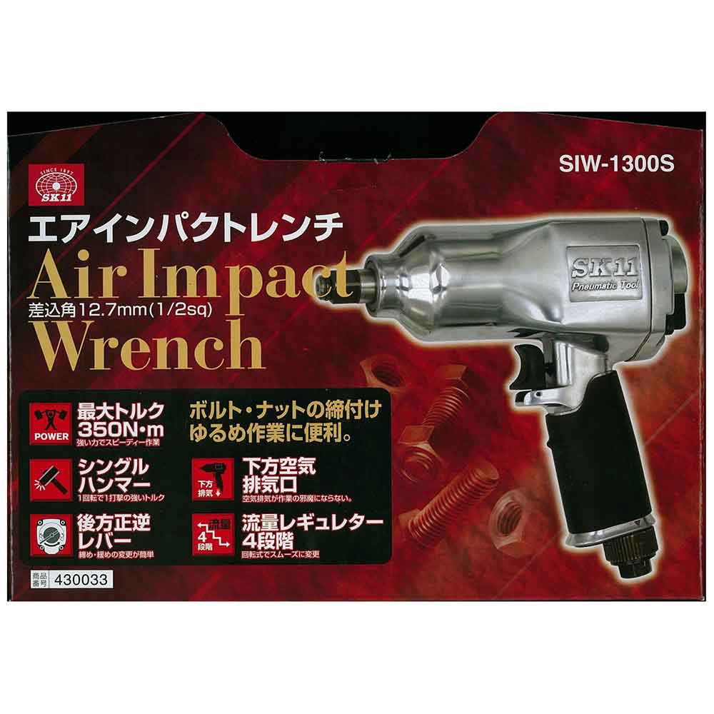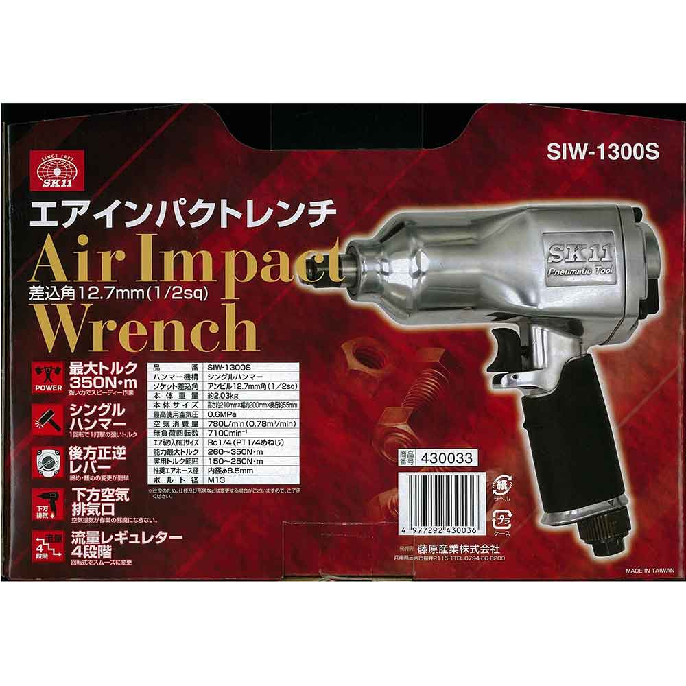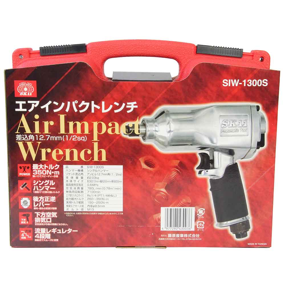 後方正逆レバーで、締め・ゆるめの変更が簡単です。 ボルト・ナットの締付・緩め作業。 最大トルク350N・mの強い力でスピーディーに作業ができます。 下方空気排気口で、空気排気が作業の邪魔になりません。 4段階流量レギュレーターは、回転式でスムーズに変更できます。 ●ハンマー機構:シングルハンマー。 ●ソケット差込角:アンビル12.7mm角(1/2sq)。 ●無負荷回転数:7100min-1。 ●空気使用量:780L/min(0.78m3/min)。 ●空気取り入れ口:Rc1/4(PT1/4めねじ)。 ●使用圧力:0.6MPa。 ●能力最大トルク:260~350N・m・実用トルク範囲150~250N・m。 ●セット内容:本体・インパクトソケット(17・19・21mm)・エア用ワンタッチプラグ(R1/4おねじ)・エアーツールオイル・シールテープ・ケース。