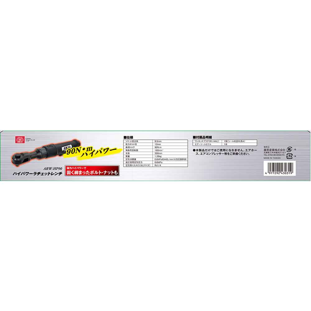 最高トルク90N・mのハイパワーラチェットレンチです。 機械などの整備・分解。 固く締まったボルト・ナットも手で緩める必要がありません。 ボディを動かすことなく緩められます。 ●ソケット差込角:9.5mm。 ●能力ボルト径:12mm。 ●最高トルク:90N・m。 ●無負荷回転数:160min-1。 ●全長:300mm。 ●質量:1.26kg。 ●空気消費量:440L/min。 ●空気取入口ねじサイズ:Rc1/4。