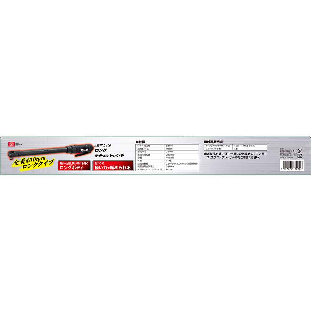 全長400mmのロングボディなので、奥まったところ、狭いところにも届きます。 機械などの整備・分解。 固く締まったボルトナットも本体が長いので、テコの原理で軽い力で緩めることが可能です(緩めたあとは早回しできます)。 緩め作業時に固く締めてあるボルト・ナットも軽い力で緩められます。 ●ソケット差込角:9.5mm。 ●能力ボルト径:10mm。 ●最高トルク:35N・m。 ●無負荷回転数:220min-1。 ●全長:400mm。 ●質量:1.0kg。 ●空気消費量:420L/min。 ●空気取入口ねじサイズ:Rc1/4。