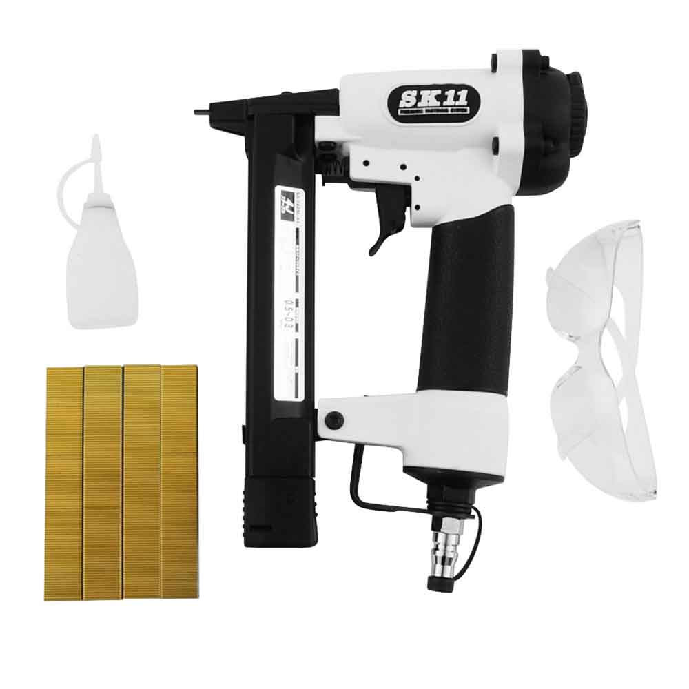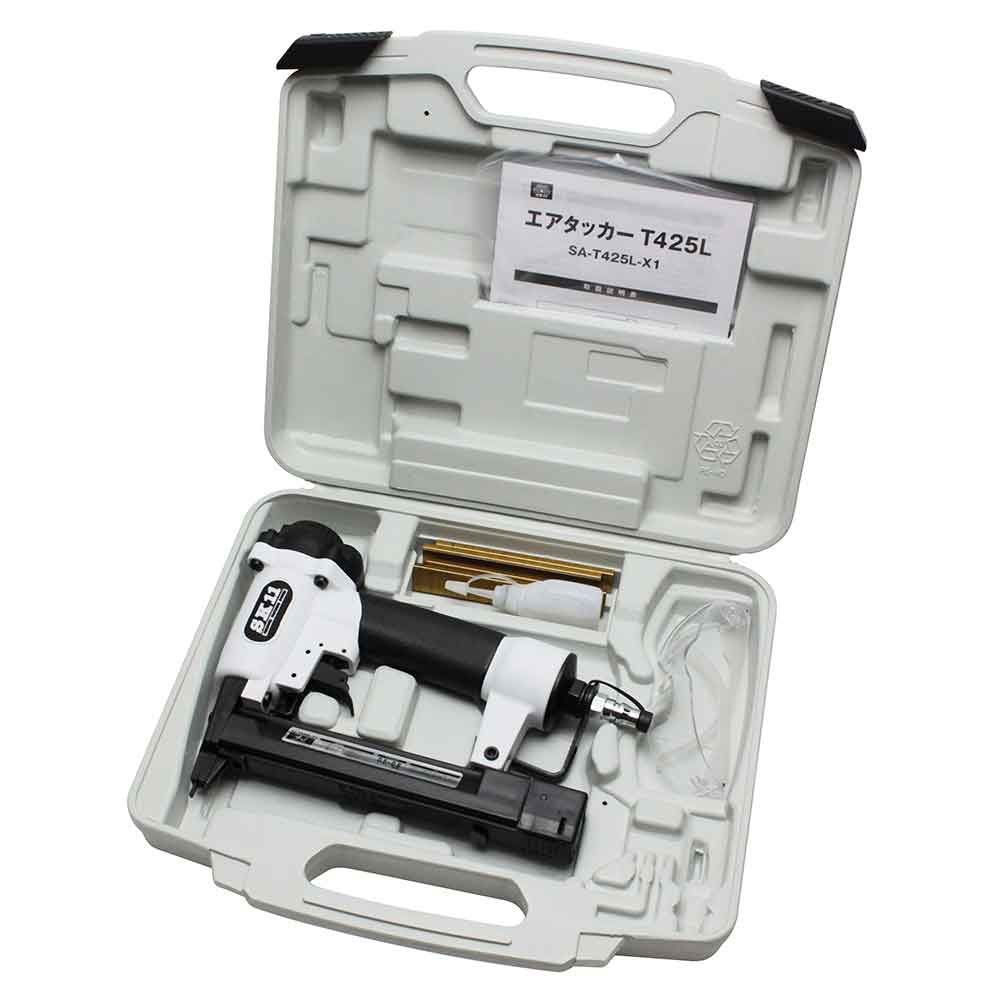 超軽量ボディのエアータッカーです。 木材の止めや石膏ボード貼り作業等。 先端を部材に当てないと発射しない安全装置付きです。 ベルトフック付で持ち運びがらくらくできます。 ●本体サイズ:L235XW55XH188mm。 ●重量:730g。 ●ステープル装填本数:100本。 ●使用空気圧範囲:0.5~0.8MPa。 ●使用オイル:タービンオイルISOVG32。 ●ステープル種類:4Jステープル。 ●ステープル足長:10~25mm。 ●鋼線太さ:0.6X1.2mm。 ●セット内容:本体・サンプルネイル・安全グラス・ネイラーオイル・ケース・取扱説明書。