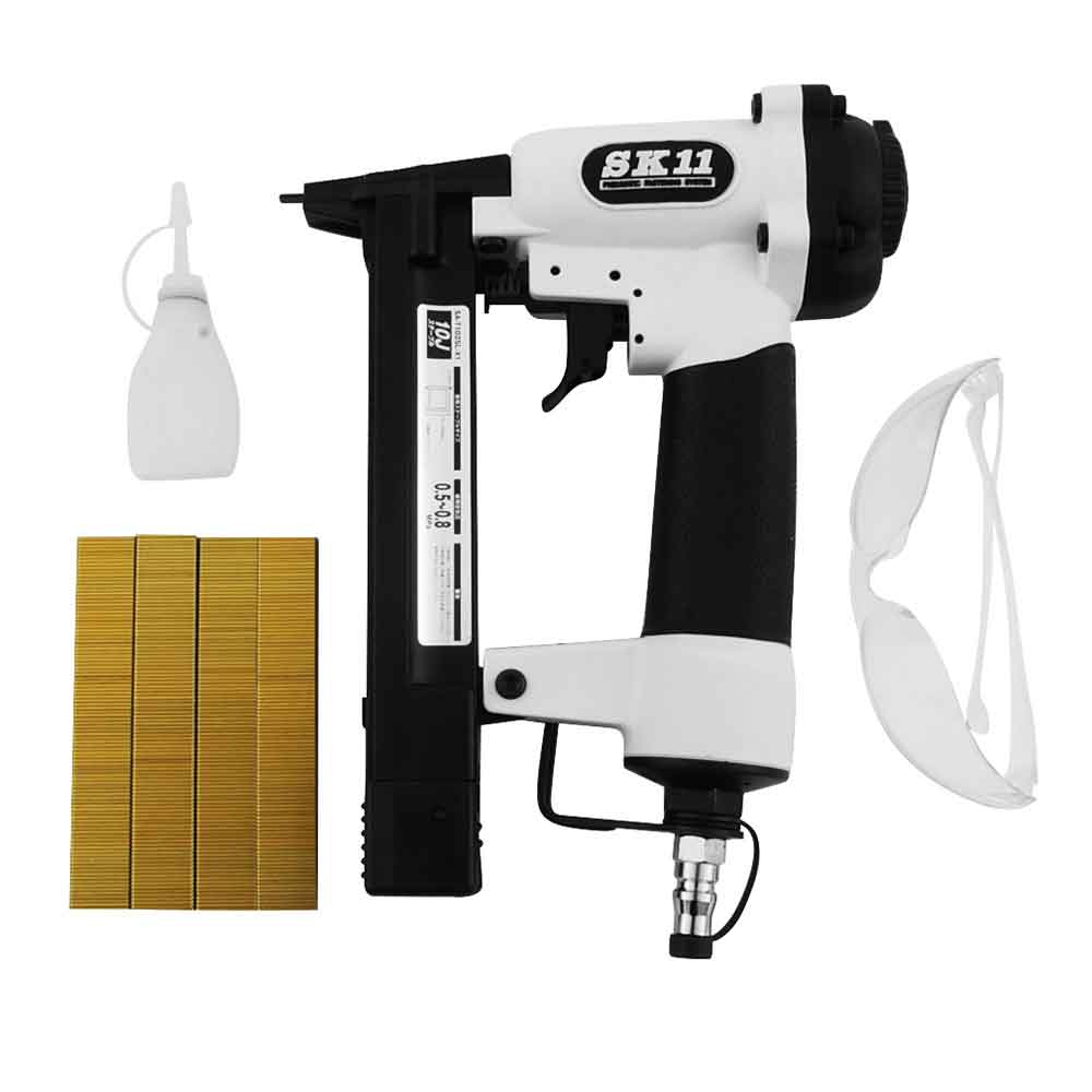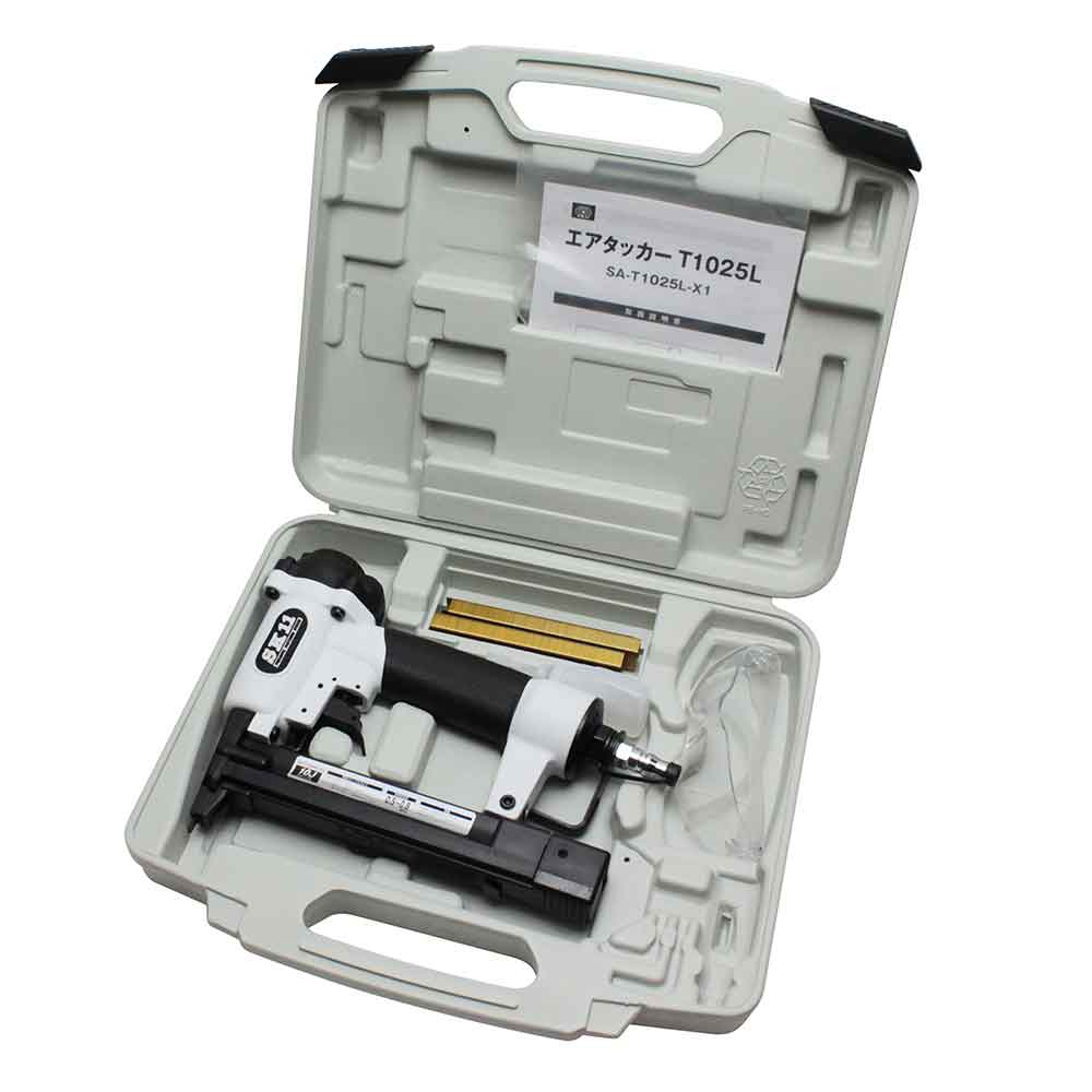 超軽量ボディのエアータッカーです。 木材の止めや石膏ボード貼り作業等。 先端を部材に当てないと発射しない安全装置付きです。 ベルトフック付で持ち運びがらくらくできます。 ●本体サイズ:L235XW55XH188mm。 ●重量:730g。 ●ステープル装填本数:100本。 ●使用空気圧範囲:0.5~0.8MPa。 ●使用オイル:タービンオイルISOVG32。 ●ステープル種類:10Jステープル。 ●ステープル足長:10~25mm。 ●鋼線太さ:0.6X1.2mm。 ●セット内容:本体・サンプルネイル・安全グラス・ネイラーオイル・ケース・取扱説明書。