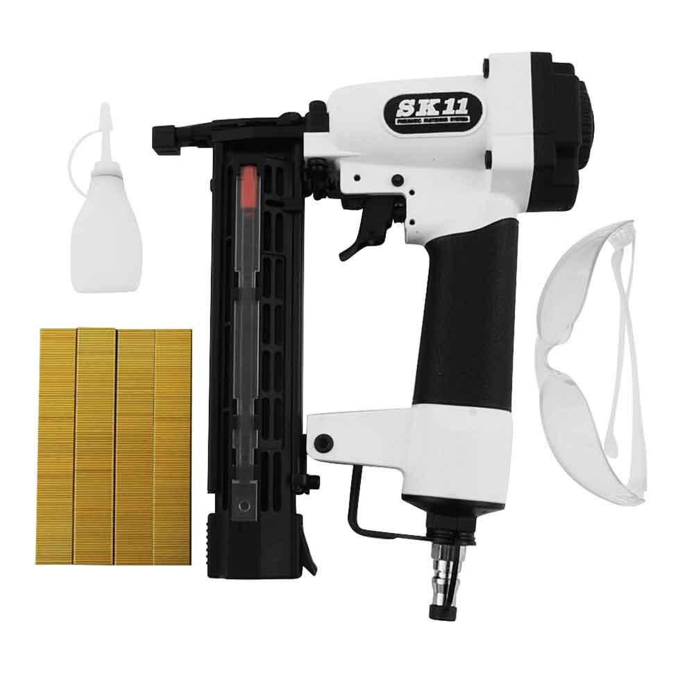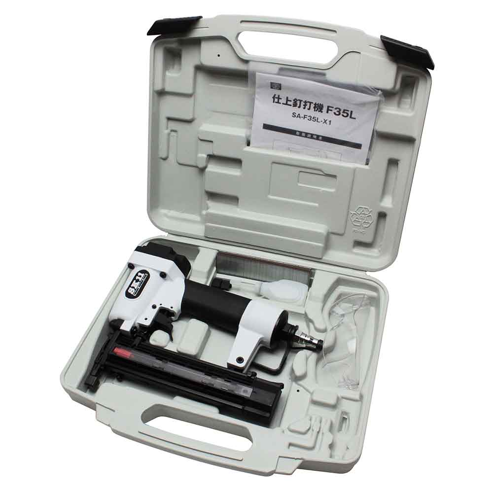 超軽量ボディのエア仕上釘打機です。 内装仕上部材、化粧合板の取り付け、家具組立て等。 釘の打込み深さを変えられる、深さ調整ダイヤル付です。 先端を部材に当てないと発射しない安全装置付きです。 ベルトフック付で持ち運びがらくらくできます。 ●本体サイズ:L255XW59XH207mm。 ●重量:870g。 ●仕上釘装填本数:100本。 ●使用空気圧範囲:0.4~0.8MPa。 ●使用オイル:タービンオイルISOVG32。 ●釘種類:仕上釘(フィニッシュ)。 ●釘足長:12~35mm。 ●鋼線太さ:1.05X1.3mm。 ●セット内容:本体・サンプルネイル・安全グラス・ネイラーオイル・ケース・取扱説明書。